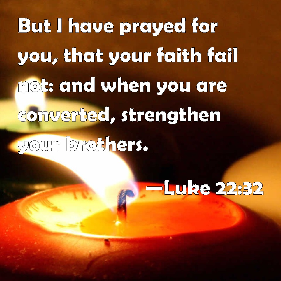 Choose a Background Luke 22:32 But I have prayed for you, that your faith fail not: and when you are converted, strengthen your brothers. KJV: But I have prayed for thee, that thy faith fail not: and when thou art converted, strengthen thy brethren. DRB: But I have prayed for thee, that thy faith fail not: and thou, being once converted, confirm thy brethren. DBT: but I have besought for thee that thy faith fail not; and thou, when once thou hast been restored, confirm thy brethren. ERV: but I made supplication for thee, that thy faith fail not: and do thou, when once thou hast turned again, stablish thy brethren. WBT: But I have prayed for thee, that thy faith fail not; and when thou art converted, strengthen thy brethren. WEB: but I prayed for you, that your faith wouldn't fail. You, when once you have turned again, establish your brothers." YLT: and I besought for thee, that thy faith may not fail; and thou, when thou didst turn, strengthen thy brethren.'Links Luke 22:32 NIV • Luke 22:32 NLT • Luke 22:32 ESV • Luke 22:32 NASB • Luke 22:32 KJV • Luke 22:32 Interlinear • Luke 22:32 Commentaries • Luke 22:32 Parallel Texts • Luke 22:32 Bible Apps • Luke 22:32 Parallel • Bible Hub |
