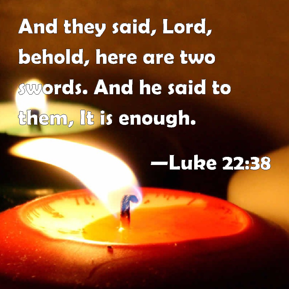 Choose a Background Luke 22:38 And they said, Lord, behold, here are two swords. And he said to them, It is enough. KJV: And they said, Lord, behold, here are two swords. And he said unto them, It is enough. DRB: But they said: Lord, behold here are two swords. And he said to them, It is enough. DBT: And they said, Lord, behold here are two swords. And he said to them, It is enough. ERV: And they said, Lord, behold, here are two swords. And he said unto them, It is enough. WBT: And they said, Lord, behold, here are two swords. And he said to them, It is enough. WEB: They said, "Lord, behold, here are two swords." He said to them, "That is enough." YLT: And they said, 'Sir, lo, here are two swords;' and he said to them, 'It is sufficient.'Links Luke 22:38 NIV • Luke 22:38 NLT • Luke 22:38 ESV • Luke 22:38 NASB • Luke 22:38 KJV • Luke 22:38 Interlinear • Luke 22:38 Commentaries • Luke 22:38 Parallel Texts • Luke 22:38 Bible Apps • Luke 22:38 Parallel • Bible Hub |