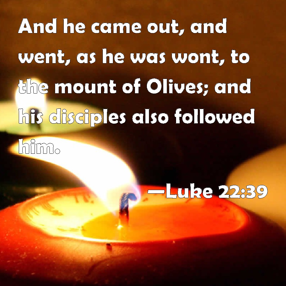 Choose a Background Luke 22:39 And he came out, and went, as he was wont, to the mount of Olives; and his disciples also followed him. KJV: And he came out, and went, as he was wont, to the mount of Olives; and his disciples also followed him. DRB: And going out, he went, according to his custom, to the mount of Olives. And his disciples also followed him. DBT: And going forth he went according to his custom to the mount of Olives, and the disciples also followed him. ERV: And he came out, and went, as his custom was, unto the mount of Olives; and the disciples also followed him. WBT: And he came out, and went, as he was wont, to the mount of Olives; and his disciples also followed him. WEB: He came out, and went, as his custom was, to the Mount of Olives. His disciples also followed him. YLT: And having gone forth, he went on, according to custom, to the mount of the Olives, and his disciples also followed him,Links Luke 22:39 NIV • Luke 22:39 NLT • Luke 22:39 ESV • Luke 22:39 NASB • Luke 22:39 KJV • Luke 22:39 Interlinear • Luke 22:39 Commentaries • Luke 22:39 Parallel Texts • Luke 22:39 Bible Apps • Luke 22:39 Parallel • Bible Hub |