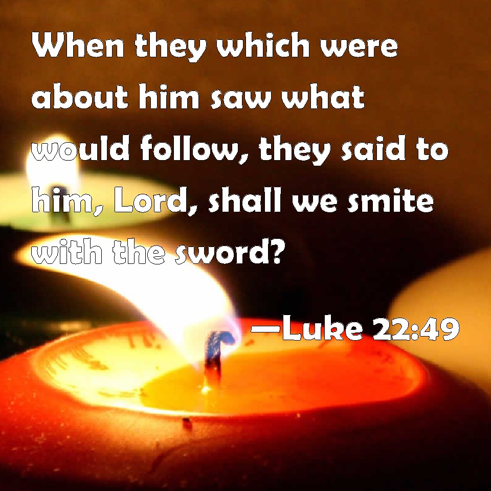 Choose a Background Luke 22:49 When they which were about him saw what would follow, they said to him, Lord, shall we smite with the sword? KJV: When they which were about him saw what would follow, they said unto him, Lord, shall we smite with the sword? DRB: And they that were about him, seeing what would follow, said to him: Lord, shall we strike with the sword? DBT: And they who were around him, seeing what was going to follow, said to him, Lord, shall we smite with the sword? ERV: And when they that were about him saw what would follow, they said, Lord, shall we smite with the sword? WBT: When they who were about him, saw what would follow, they said to him, Lord, shall we smite with the sword? WEB: When those who were around him saw what was about to happen, they said to him, "Lord, shall we strike with the sword?" YLT: And those about him, having seen what was about to be, said to him, 'Sir, shall we smite with a sword?'Links Luke 22:49 NIV • Luke 22:49 NLT • Luke 22:49 ESV • Luke 22:49 NASB • Luke 22:49 KJV • Luke 22:49 Interlinear • Luke 22:49 Commentaries • Luke 22:49 Parallel Texts • Luke 22:49 Bible Apps • Luke 22:49 Parallel • Bible Hub |