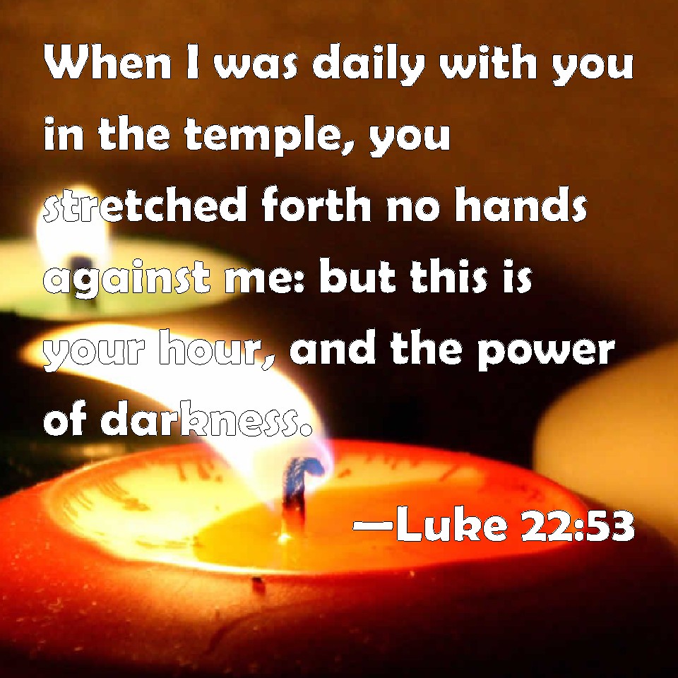 Choose a Background Luke 22:53 When I was daily with you in the temple, you stretched forth no hands against me: but this is your hour, and the power of darkness. KJV: When I was daily with you in the temple, ye stretched forth no hands against me: but this is your hour, and the power of darkness. DRB: When I was daily with you in the temple, you did not stretch forth your hands against me: but this is your hour, and the power of darkness. DBT: When I was day by day with you in the temple ye did not stretch out your hands against me; but this is your hour and the power of darkness. ERV: When I was daily with you in the temple, ye stretched not forth your hands against me: but this is your hour, and the power of darkness. WBT: When I was daily with you in the temple, ye stretched forth no hands against me: but this is your hour, and the power of darkness. WEB: When I was with you in the temple daily, you didn't stretch out your hands against me. But this is your hour, and the power of darkness." YLT: while daily I was with you in the temple, ye did stretch forth no hands against me; but this is your hour and the power of the darkness.'Links Luke 22:53 NIV • Luke 22:53 NLT • Luke 22:53 ESV • Luke 22:53 NASB • Luke 22:53 KJV • Luke 22:53 Interlinear • Luke 22:53 Commentaries • Luke 22:53 Parallel Texts • Luke 22:53 Bible Apps • Luke 22:53 Parallel • Bible Hub |