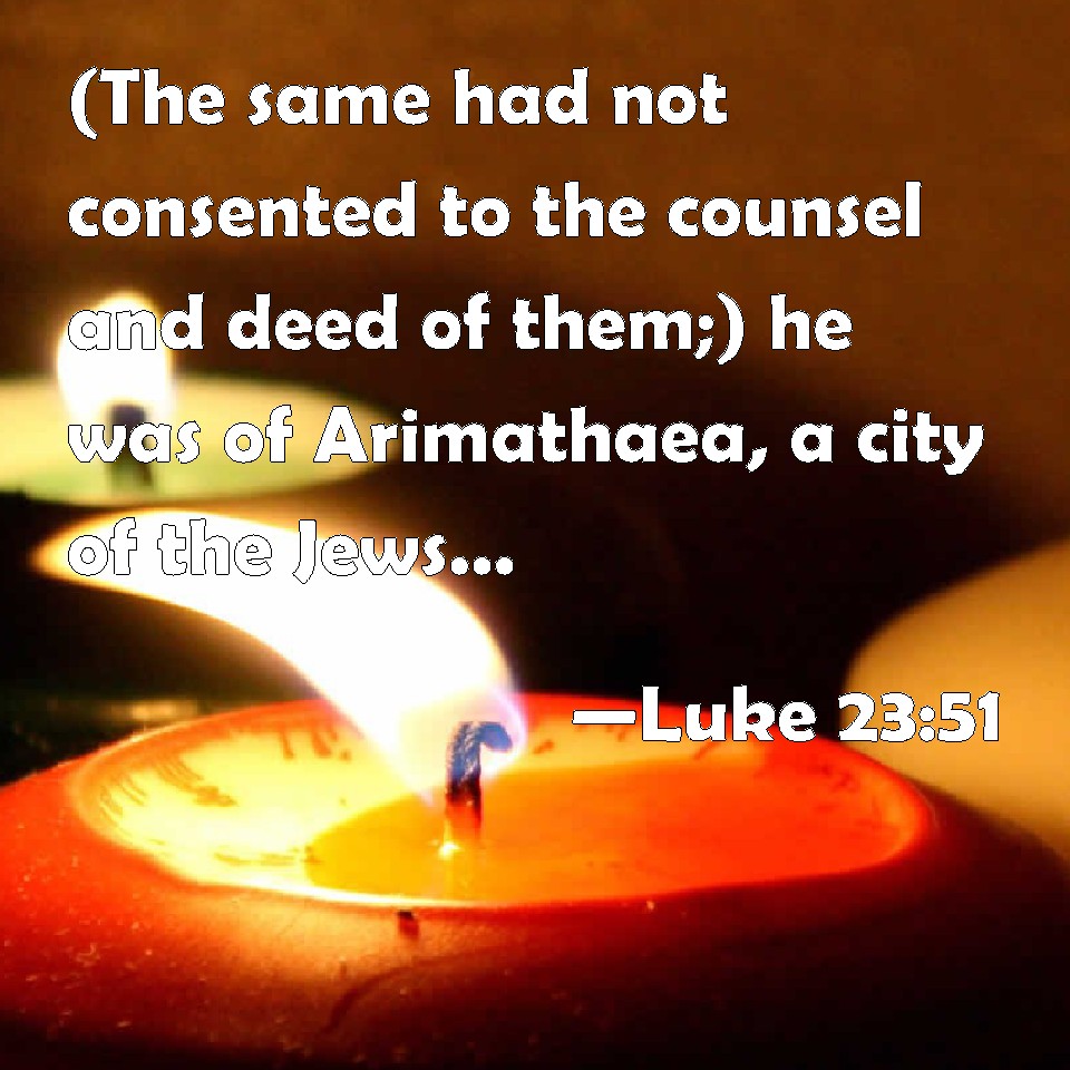 Choose a Background Luke 23:51 (The same had not consented to the counsel and deed of them;) he was of Arimathaea, a city of the Jews: who also himself waited for the kingdom of God. KJV: (The same had not consented to the counsel and deed of them;) he was of Arimathaea, a city of the Jews: who also himself waited for the kingdom of God. DRB: (The same had not consented to their counsel and doings;) of Arimathea, a city of Judea; who also himself looked for the kingdom of God. DBT: (this man had not assented to their counsel and deed), of Arimathaea, a city of the Jews, who also waited, himself also, for the kingdom of God ERV: (he had not consented to their counsel and deed), a man of Arimathaea, a city of the Jews, who was looking for the kingdom of God: WBT: (The same had not consented to the counsel and deed of them) he was of Arimathea, a city of the Jews; who also himself waited for the kingdom of God. WEB: (he had not consented to their counsel and deed), from Arimathaea, a city of the Jews, who was also waiting for the Kingdom of God: YLT: — he was not consenting to their counsel and deed — from Arimathea, a city of the Jews, who also himself was expecting the reign of God,Links Luke 23:51 NIV • Luke 23:51 NLT • Luke 23:51 ESV • Luke 23:51 NASB • Luke 23:51 KJV • Luke 23:51 Interlinear • Luke 23:51 Commentaries • Luke 23:51 Parallel Texts • Luke 23:51 Bible Apps • Luke 23:51 Parallel • Bible Hub |