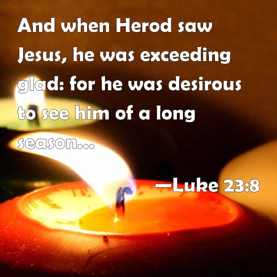 Choose a Background Luke 23:8 And when Herod saw Jesus, he was exceeding glad: for he was desirous to see him of a long season, because he had heard many things of him; and he hoped to have seen some miracle done by him. KJV: And when Herod saw Jesus, he was exceeding glad: for he was desirous to see him of a long season, because he had heard many things of him; and he hoped to have seen some miracle done by him. DRB: And Herod, seeing Jesus, was very glad; for he was desirous of a long time to see him, because he had heard many things of him; and he hoped to see some sign wrought by him. DBT: And when Herod saw Jesus he greatly rejoiced, for he had been a long while desirous of seeing him, because of hearing many things concerning him, and he hoped to see some sign done by him; ERV: Now when Herod saw Jesus, he was exceeding glad: for he was of a long time desirous to see him, because he had heard concerning him; and he hoped to see some miracle done by him. WBT: And when Herod saw Jesus, he was exceeding glad: for he had been for a long time, desirous to see him, because he had heard many things of him; and he hoped to see some miracle done by him. WEB: Now when Herod saw Jesus, he was exceedingly glad, for he had wanted to see him for a long time, because he had heard many things about him. He hoped to see some miracle done by him. YLT: And Herod having seen Jesus did rejoice exceedingly, for he was wishing for a long time to see him, because of hearing many things about him, and he was hoping some sign to see done by him,Links Luke 23:8 NIV • Luke 23:8 NLT • Luke 23:8 ESV • Luke 23:8 NASB • Luke 23:8 KJV • Luke 23:8 Interlinear • Luke 23:8 Commentaries • Luke 23:8 Parallel Texts • Luke 23:8 Bible Apps • Luke 23:8 Parallel • Bible Hub |