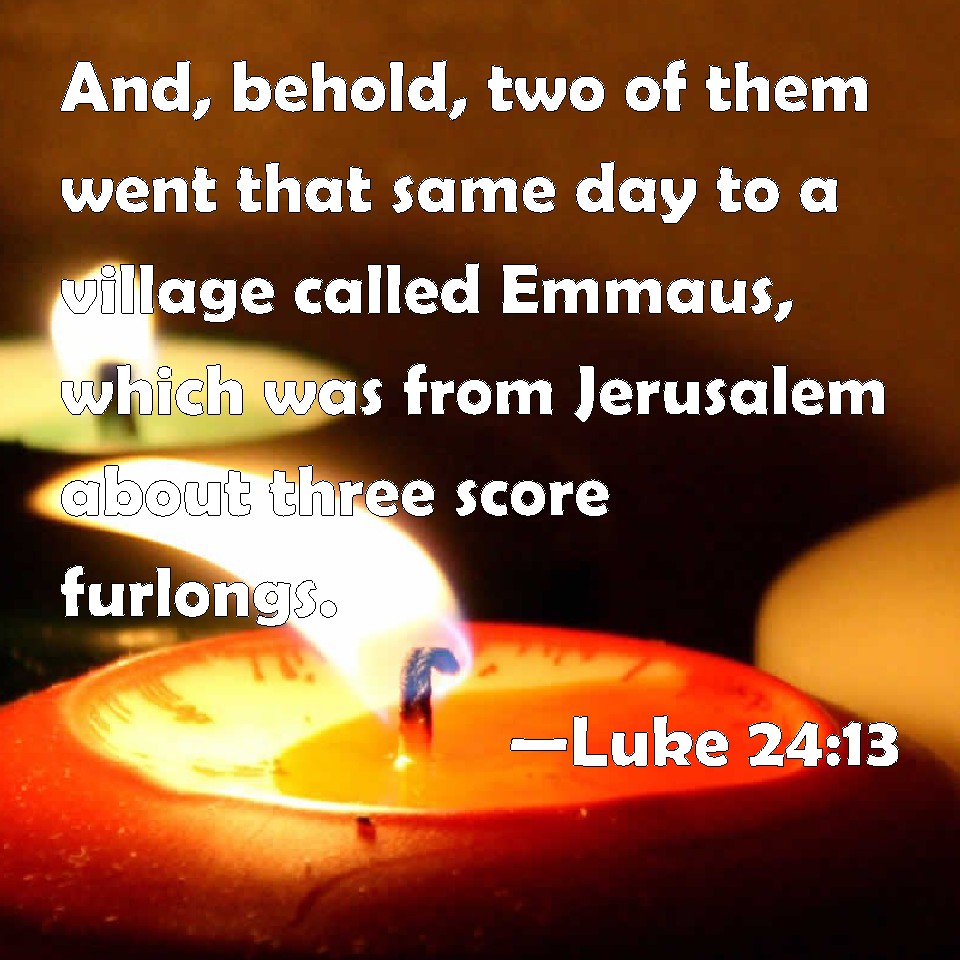Choose a Background Luke 24:13 And, behold, two of them went that same day to a village called Emmaus, which was from Jerusalem about three score furlongs. KJV: And, behold, two of them went that same day to a village called Emmaus, which was from Jerusalem about threescore furlongs. DRB: And behold, two of them went, the same day, to a town which was sixty furlongs from Jerusalem, named Emmaus. DBT: And behold, two of them were going on the same day to a village distant sixty stadia from Jerusalem, called Emmaus; ERV: And behold, two of them were going that very day to a village named Emmaus, which was threescore furlongs from Jerusalem. WBT: And behold, two of them went that same day to a village called Emmaus, which was from Jerusalem about sixty furlongs. WEB: Behold, two of them were going that very day to a village named Emmaus, which was sixty stadia from Jerusalem. YLT: And, lo, two of them were going on during that day to a village, distant sixty furlongs from Jerusalem, the name of which is Emmaus,Links Luke 24:13 NIV • Luke 24:13 NLT • Luke 24:13 ESV • Luke 24:13 NASB • Luke 24:13 KJV • Luke 24:13 Interlinear • Luke 24:13 Commentaries • Luke 24:13 Parallel Texts • Luke 24:13 Bible Apps • Luke 24:13 Parallel • Bible Hub |