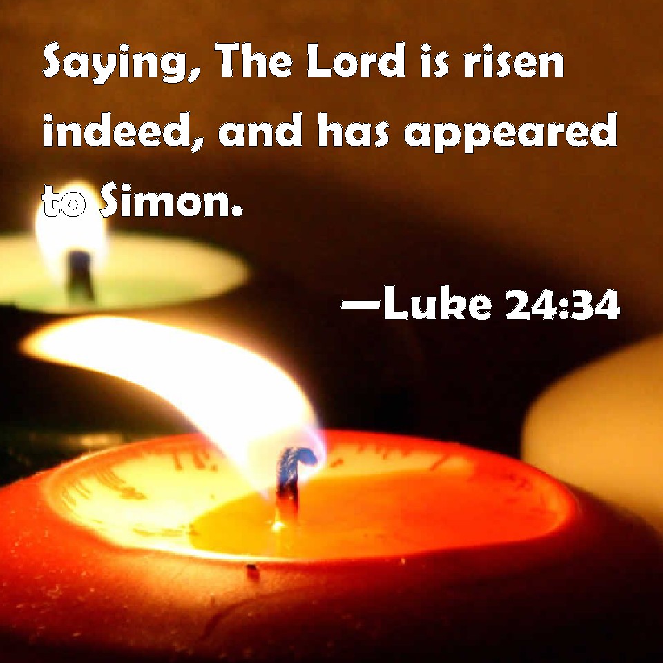 Choose a Background Luke 24:34 Saying, The Lord is risen indeed, and has appeared to Simon. KJV: Saying, The Lord is risen indeed, and hath appeared to Simon. DRB: Saying: The Lord is risen indeed, and hath appeared to Simon. DBT: saying, The Lord is indeed risen and has appeared to Simon. ERV: saying, The Lord is risen indeed, and hath appeared to Simon. WBT: Saying, The Lord is risen indeed, and hath appeared to Simon. WEB: saying, "The Lord is risen indeed, and has appeared to Simon!" YLT: saying — 'The Lord was raised indeed, and was seen by Simon;'Links Luke 24:34 NIV • Luke 24:34 NLT • Luke 24:34 ESV • Luke 24:34 NASB • Luke 24:34 KJV • Luke 24:34 Interlinear • Luke 24:34 Commentaries • Luke 24:34 Parallel Texts • Luke 24:34 Bible Apps • Luke 24:34 Parallel • Bible Hub |