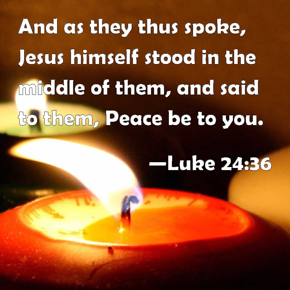 Choose a Background Luke 24:36 And as they thus spoke, Jesus himself stood in the middle of them, and said to them, Peace be to you. KJV: And as they thus spake, Jesus himself stood in the midst of them, and saith unto them, Peace be unto you. DRB: Now whilst they were speaking these things, Jesus stood in the midst of them, and saith to them: Peace be to you; it is I, fear not. DBT: And as they were saying these things, he himself stood in their midst, and says to them, Peace be unto you. ERV: And as they spake these things, he himself stood in the midst of them, and saith unto them, Peace be unto you. WBT: And as they were thus speaking, Jesus himself stood in the midst of them, and saith to them, Peace be to you. WEB: As they said these things, Jesus himself stood among them, and said to them, "Peace be to you." YLT: and as they are speaking these things, Jesus himself stood in the midst of them, and saith to them, 'Peace — to you;'Links Luke 24:36 NIV • Luke 24:36 NLT • Luke 24:36 ESV • Luke 24:36 NASB • Luke 24:36 KJV • Luke 24:36 Interlinear • Luke 24:36 Commentaries • Luke 24:36 Parallel Texts • Luke 24:36 Bible Apps • Luke 24:36 Parallel • Bible Hub |