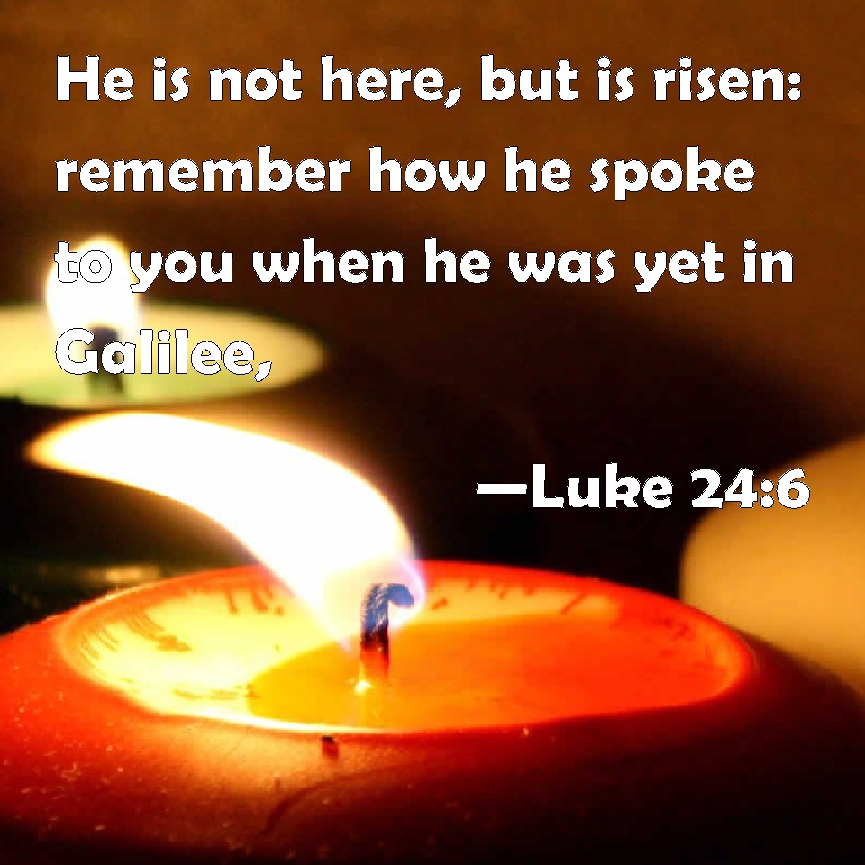 Choose a Background Luke 24:6 He is not here, but is risen: remember how he spoke to you when he was yet in Galilee, KJV: He is not here, but is risen: remember how he spake unto you when he was yet in Galilee, DRB: He is not here, but is risen. Remember how he spoke unto you, when he was in Galilee, DBT: He is not here, but is risen: remember how he spoke to you, being yet in Galilee, ERV: He is not here, but is risen: remember how he spake unto you when he was yet in Galilee, WBT: He is not here, but is risen. Remember how he spoke to you when he was yet in Galilee, WEB: He isn't here, but is risen. Remember what he told you when he was still in Galilee, YLT: he is not here, but was raised; remember how he spake to you, being yet in Galilee,Links Luke 24:6 NIV • Luke 24:6 NLT • Luke 24:6 ESV • Luke 24:6 NASB • Luke 24:6 KJV • Luke 24:6 Interlinear • Luke 24:6 Commentaries • Luke 24:6 Parallel Texts • Luke 24:6 Bible Apps • Luke 24:6 Parallel • Bible Hub |
