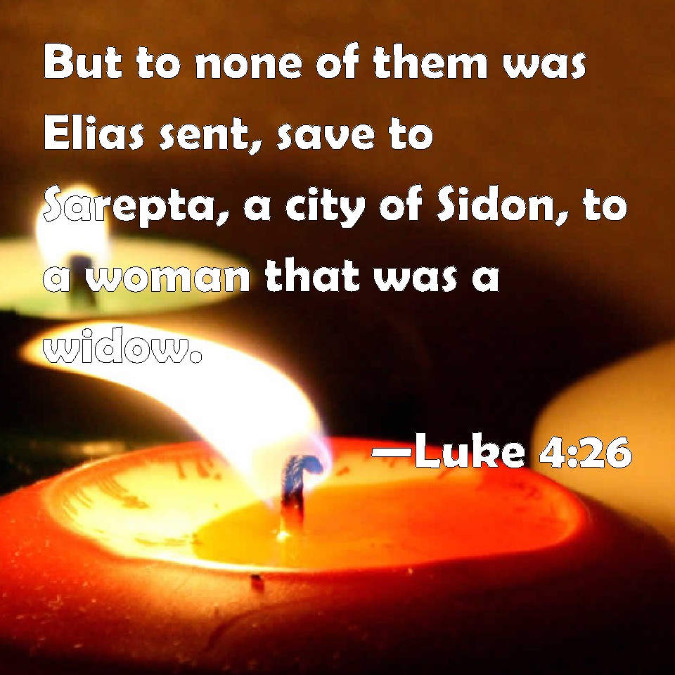 Choose a Background Luke 4:26 But to none of them was Elias sent, save to Sarepta, a city of Sidon, to a woman that was a widow. KJV: But unto none of them was Elias sent, save unto Sarepta, a city of Sidon, unto a woman that was a widow. DRB: And to none of them was Elias sent, but to Sarepta of Sidon, to a widow woman. DBT: and to none of them was Elias sent but to Sarepta of Sidonia, to a woman that was a widow. ERV: and unto none of them was Elijah sent, but only to Zarephath, in the land of Sidon, unto a woman that was a widow. WBT: But to none of them was Elijah sent, save to Sarepta, a city of Sidon, to a woman that was a widow. WEB: Elijah was sent to none of them, except to Zarephath, in the land of Sidon, to a woman who was a widow. YLT: and unto none of them was Elijah sent, but — to Sarepta of Sidon, unto a woman, a widow;Links Luke 4:26 NIV • Luke 4:26 NLT • Luke 4:26 ESV • Luke 4:26 NASB • Luke 4:26 KJV • Luke 4:26 Interlinear • Luke 4:26 Commentaries • Luke 4:26 Parallel Texts • Luke 4:26 Bible Apps • Luke 4:26 Parallel • Bible Hub |
