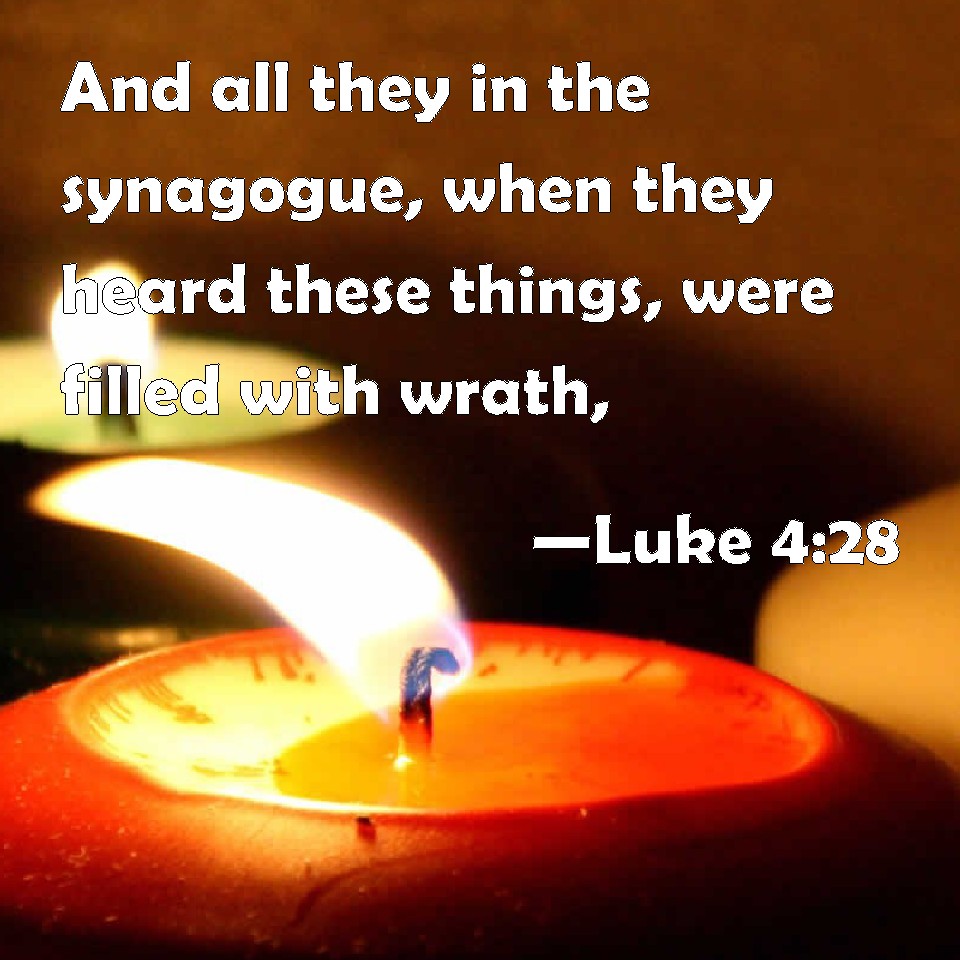 Choose a Background Luke 4:28 And all they in the synagogue, when they heard these things, were filled with wrath, KJV: And all they in the synagogue, when they heard these things, were filled with wrath, DRB: And all they in the synagogue, hearing these things, were filled with anger. DBT: And they were all filled with rage in the synagogue, hearing these things; ERV: And they were all filled with wrath in the synagogue, as they heard these things; WBT: And all they in the synagogue, when they heard these things, were filled with wrath, WEB: They were all filled with wrath in the synagogue, as they heard these things. YLT: And all in the synagogue were filled with wrath, hearing these things,Links Luke 4:28 NIV • Luke 4:28 NLT • Luke 4:28 ESV • Luke 4:28 NASB • Luke 4:28 KJV • Luke 4:28 Interlinear • Luke 4:28 Commentaries • Luke 4:28 Parallel Texts • Luke 4:28 Bible Apps • Luke 4:28 Parallel • Bible Hub |
