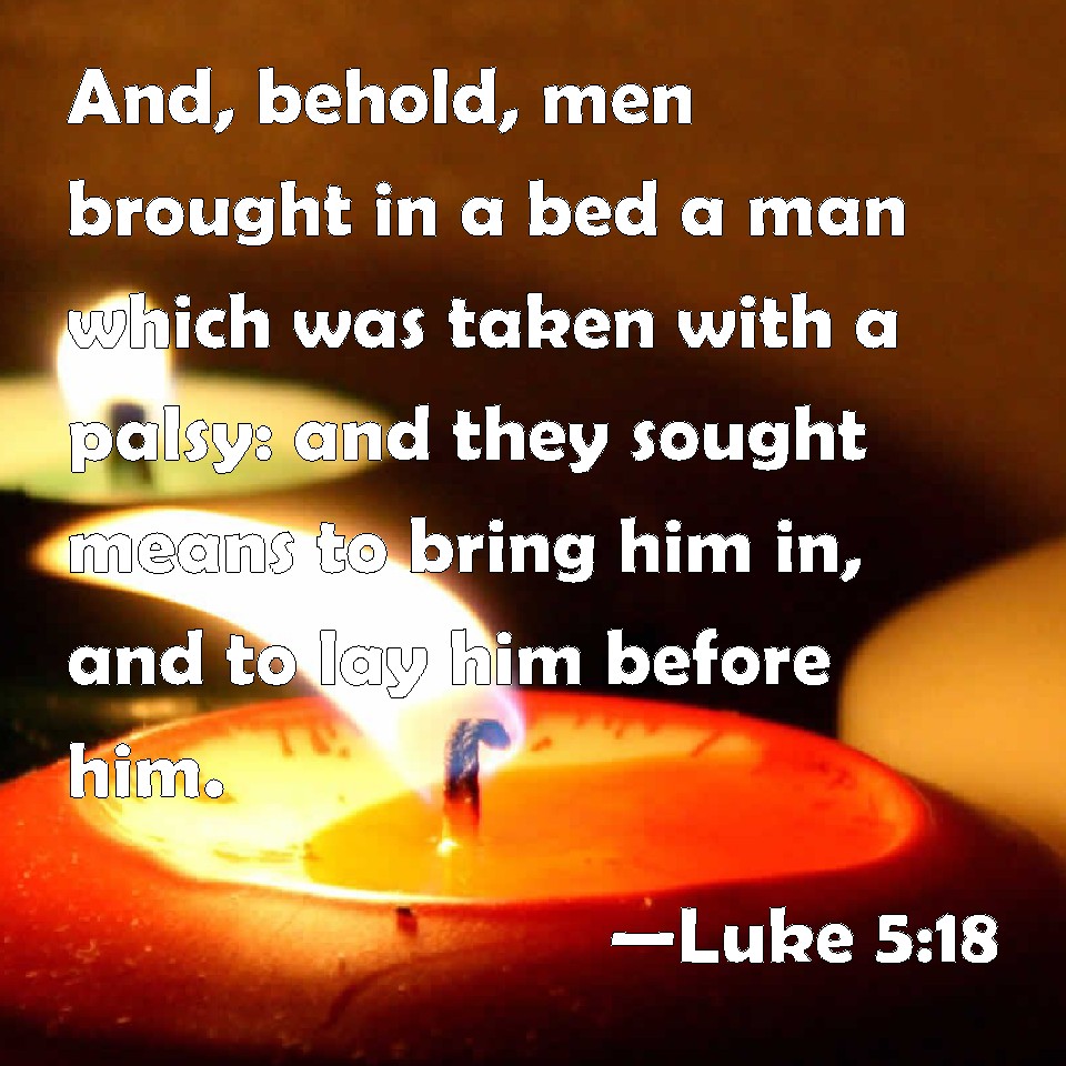 Choose a Background Luke 5:18 And, behold, men brought in a bed a man which was taken with a palsy: and they sought means to bring him in, and to lay him before him. KJV: And, behold, men brought in a bed a man which was taken with a palsy: and they sought means to bring him in, and to lay him before him. DRB: And behold, men brought in a bed a man, who had the palsy: and they sought means to bring him in, and to lay him before him. DBT: And lo, men bringing upon a couch a man who was paralysed; and they sought to bring him in, and put him before him. ERV: And behold, men bring on a bed a man that was palsied: and they sought to bring him in, and to lay him before him. WBT: And behold, men brought in a bed a man who was taken with the palsy: and they sought means to bring him in, and to lay him before him. WEB: Behold, men brought a paralyzed man on a cot, and they sought to bring him in to lay before Jesus. YLT: And lo, men bearing upon a couch a man, who hath been struck with palsy, and they were seeking to bring him in, and to place before him,Links Luke 5:18 NIV • Luke 5:18 NLT • Luke 5:18 ESV • Luke 5:18 NASB • Luke 5:18 KJV • Luke 5:18 Interlinear • Luke 5:18 Commentaries • Luke 5:18 Parallel Texts • Luke 5:18 Bible Apps • Luke 5:18 Parallel • Bible Hub |