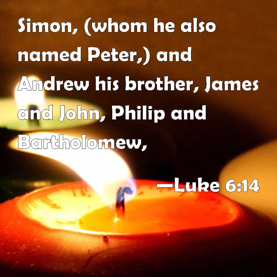 Choose a Background Luke 6:14 Simon, (whom he also named Peter,) and Andrew his brother, James and John, Philip and Bartholomew, KJV: Simon, (whom he also named Peter,) and Andrew his brother, James and John, Philip and Bartholomew, DRB: Simon, whom he surnamed Peter, and Andrew his brother, James and John, Philip and Bartholomew, DBT: Simon, to whom also he gave the name of Peter, and Andrew his brother, and James and John, and Philip and Bartholomew, ERV: Simon, whom he also named Peter, and Andrew his brother, and James and John, and Philip and Bartholomew, WBT: Simon (whom he also named Peter) and Andrew his brother, James and John, and Philip and Bartholomew, WEB: Simon, whom he also named Peter; Andrew, his brother; James; John; Philip; Bartholomew; YLT: (Simon, whom also he named Peter, and Andrew his brother, James and John, Philip and Bartholomew,Links Luke 6:14 NIV • Luke 6:14 NLT • Luke 6:14 ESV • Luke 6:14 NASB • Luke 6:14 KJV • Luke 6:14 Interlinear • Luke 6:14 Commentaries • Luke 6:14 Parallel Texts • Luke 6:14 Bible Apps • Luke 6:14 Parallel • Bible Hub |