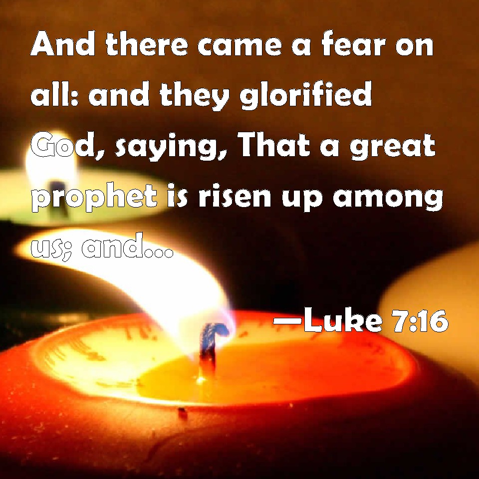Choose a Background Luke 7:16 And there came a fear on all: and they glorified God, saying, That a great prophet is risen up among us; and, That God has visited his people. KJV: And there came a fear on all: and they glorified God, saying, That a great prophet is risen up among us; and, That God hath visited his people. DRB: And there came a fear on them all: and they glorified God, saying: A great prophet is risen up among us: and, God hath visited his people. DBT: And fear seized on all, and they glorified God, saying, A great prophet has been raised up amongst us; and God has visited his people. ERV: And fear took hold on all: and they glorified God, saying, A great prophet is arisen among us: and, God hath visited his people. WBT: And there came a fear on all: and they glorified God, saying, That a great prophet hath risen among us; and, That God hath visited his people. WEB: Fear took hold of all, and they glorified God, saying, "A great prophet has arisen among us!" and, "God has visited his people!" YLT: and fear took hold of all, and they were glorifying God, saying — 'A great prophet hath risen among us,' and — 'God did look upon His people.'Links Luke 7:16 NIV • Luke 7:16 NLT • Luke 7:16 ESV • Luke 7:16 NASB • Luke 7:16 KJV • Luke 7:16 Interlinear • Luke 7:16 Commentaries • Luke 7:16 Parallel Texts • Luke 7:16 Bible Apps • Luke 7:16 Parallel • Bible Hub |