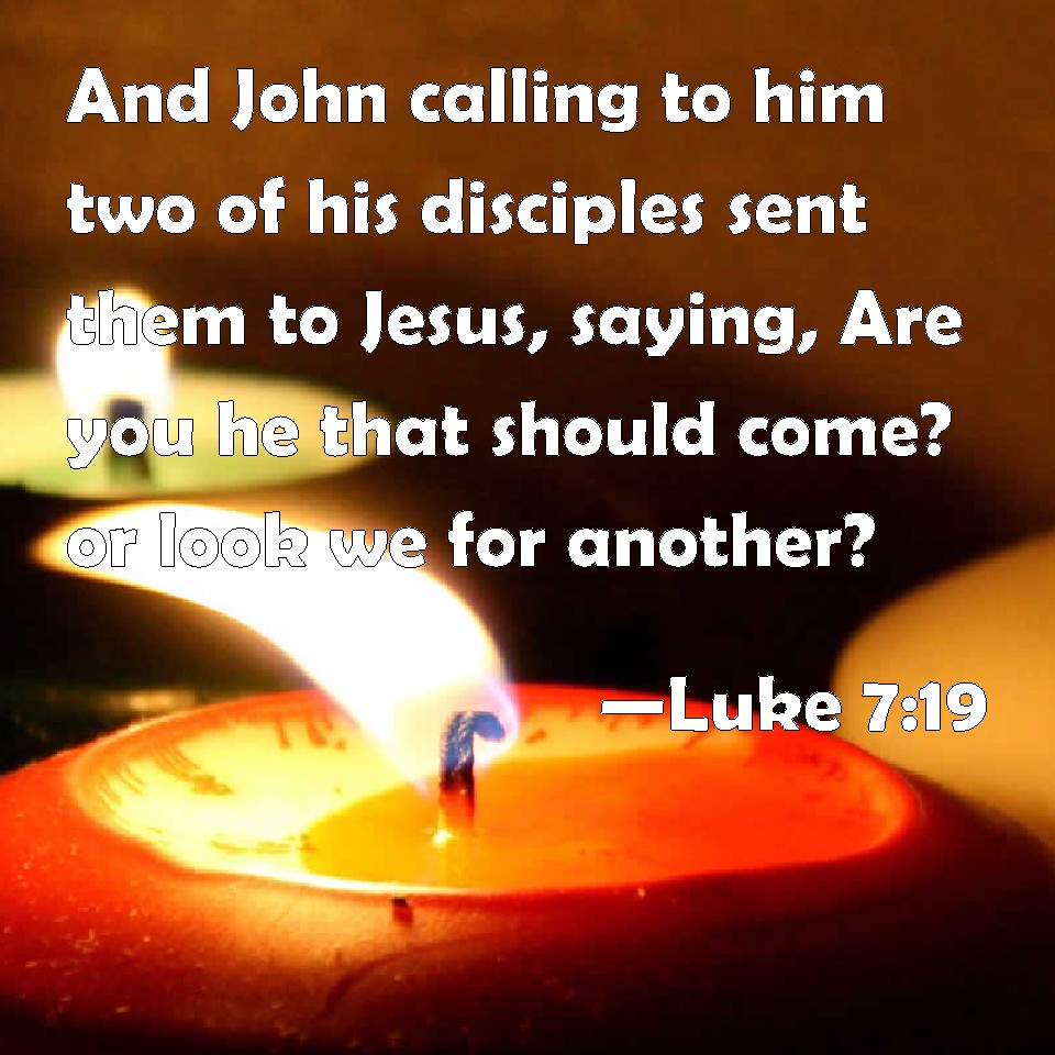 Choose a Background Luke 7:19 And John calling to him two of his disciples sent them to Jesus, saying, Are you he that should come? or look we for another? KJV: And John calling unto him two of his disciples sent them to Jesus, saying, Art thou he that should come? or look we for another? DRB: And John called to him two of his disciples, and sent them to Jesus, saying: Art thou he that art to come; or look we for another? DBT: and John, having called two of his disciples, sent to Jesus, saying, Art thou he that is coming, or are we to wait for another? ERV: And John calling unto him two of his disciples sent them to the Lord, saying, Art thou he that cometh, or look we for another? WBT: And John calling two of his disciples sent them to Jesus, saying, Art thou he that should come? or look we for another? WEB: John, calling to himself two of his disciples, sent them to Jesus, saying, "Are you the one who is coming, or should we look for another?" YLT: and John having called near a certain two of his disciples, sent unto Jesus, saying, 'Art thou he who is coming, or for another do we look?'Links Luke 7:19 NIV • Luke 7:19 NLT • Luke 7:19 ESV • Luke 7:19 NASB • Luke 7:19 KJV • Luke 7:19 Interlinear • Luke 7:19 Commentaries • Luke 7:19 Parallel Texts • Luke 7:19 Bible Apps • Luke 7:19 Parallel • Bible Hub |