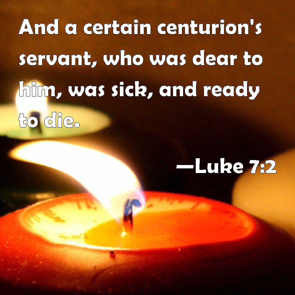 Choose a Background Luke 7:2 And a certain centurion's servant, who was dear to him, was sick, and ready to die. KJV: And a certain centurion's servant, who was dear unto him, was sick, and ready to die. DRB: And the servant of a certain centurion, who was dear to him, being sick, was ready to die. DBT: And a certain centurion's bondman who was dear to him was ill and about to die; ERV: And a certain centurion's servant, who was dear unto him, was sick and at the point of death. WBT: And a certain centurion's servant, who was dear to him, was sick, and ready to die. WEB: A certain centurion's servant, who was dear to him, was sick and at the point of death. YLT: and a certain centurion's servant being ill, was about to die, who was much valued by him,Links Luke 7:2 NIV • Luke 7:2 NLT • Luke 7:2 ESV • Luke 7:2 NASB • Luke 7:2 KJV • Luke 7:2 Interlinear • Luke 7:2 Commentaries • Luke 7:2 Parallel Texts • Luke 7:2 Bible Apps • Luke 7:2 Parallel • Bible Hub |