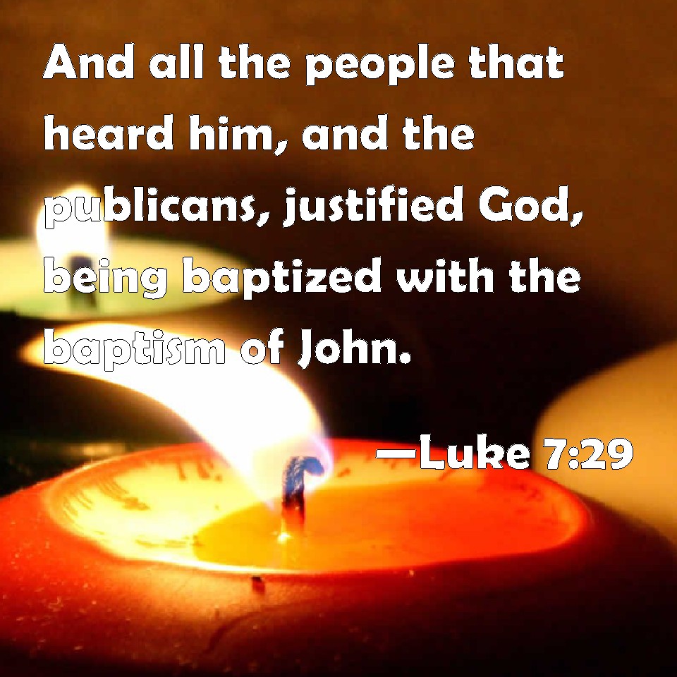 Choose a Background Luke 7:29 And all the people that heard him, and the publicans, justified God, being baptized with the baptism of John. KJV: And all the people that heard him, and the publicans, justified God, being baptized with the baptism of John. DRB: And all the people hearing, and the publicans, justified God, being baptized with John's baptism. DBT: (And all the people who heard it, and the tax-gatherers, justified God, having been baptised with the baptism of John; ERV: And all the people when they heard, and the publicans, justified God, being baptized with the baptism of John. WBT: And all the people that heard him, and the publicans, justified God, being baptized with the baptism of John. WEB: When all the people and the tax collectors heard this, they declared God to be just, having been baptized with John's baptism. YLT: And all the people having heard, and the tax-gatherers, declared God righteous, having been baptized with the baptism of John,Links Luke 7:29 NIV • Luke 7:29 NLT • Luke 7:29 ESV • Luke 7:29 NASB • Luke 7:29 KJV • Luke 7:29 Interlinear • Luke 7:29 Commentaries • Luke 7:29 Parallel Texts • Luke 7:29 Bible Apps • Luke 7:29 Parallel • Bible Hub |
