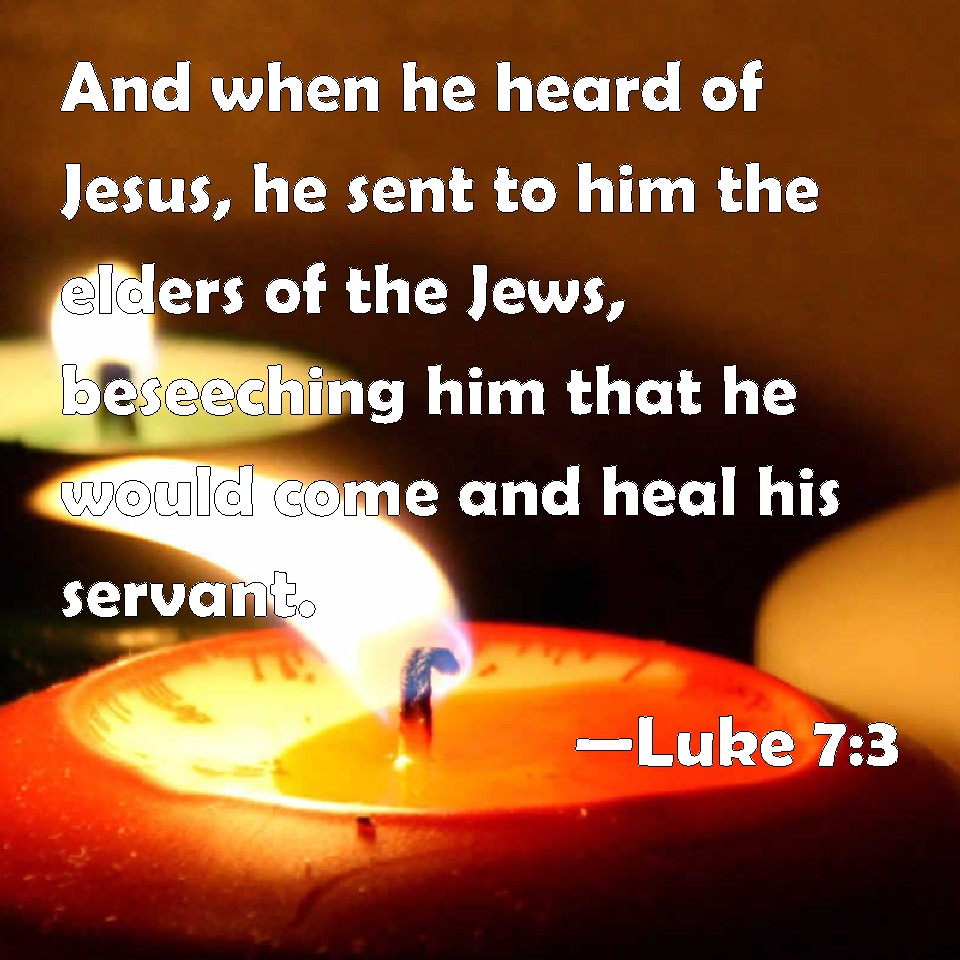 Choose a Background Luke 7:3 And when he heard of Jesus, he sent to him the elders of the Jews, beseeching him that he would come and heal his servant. KJV: And when he heard of Jesus, he sent unto him the elders of the Jews, beseeching him that he would come and heal his servant. DRB: And when he had heard of Jesus, he sent unto him the ancients of the Jews, desiring him to come and heal his servant. DBT: and having heard of Jesus, he sent to him elders of the Jews, begging him that he might come and save his bondman. ERV: And when he heard concerning Jesus, he sent unto him elders of the Jews, asking him that he would come and save his servant. WBT: And when he heard of Jesus, he sent to him the elders of the Jews, beseeching him that he would come and heal his servant. WEB: When he heard about Jesus, he sent to him elders of the Jews, asking him to come and save his servant. YLT: and having heard about Jesus, he sent unto him elders of the Jews, beseeching him, that having come he might thoroughly save his servant.Links Luke 7:3 NIV • Luke 7:3 NLT • Luke 7:3 ESV • Luke 7:3 NASB • Luke 7:3 KJV • Luke 7:3 Interlinear • Luke 7:3 Commentaries • Luke 7:3 Parallel Texts • Luke 7:3 Bible Apps • Luke 7:3 Parallel • Bible Hub |