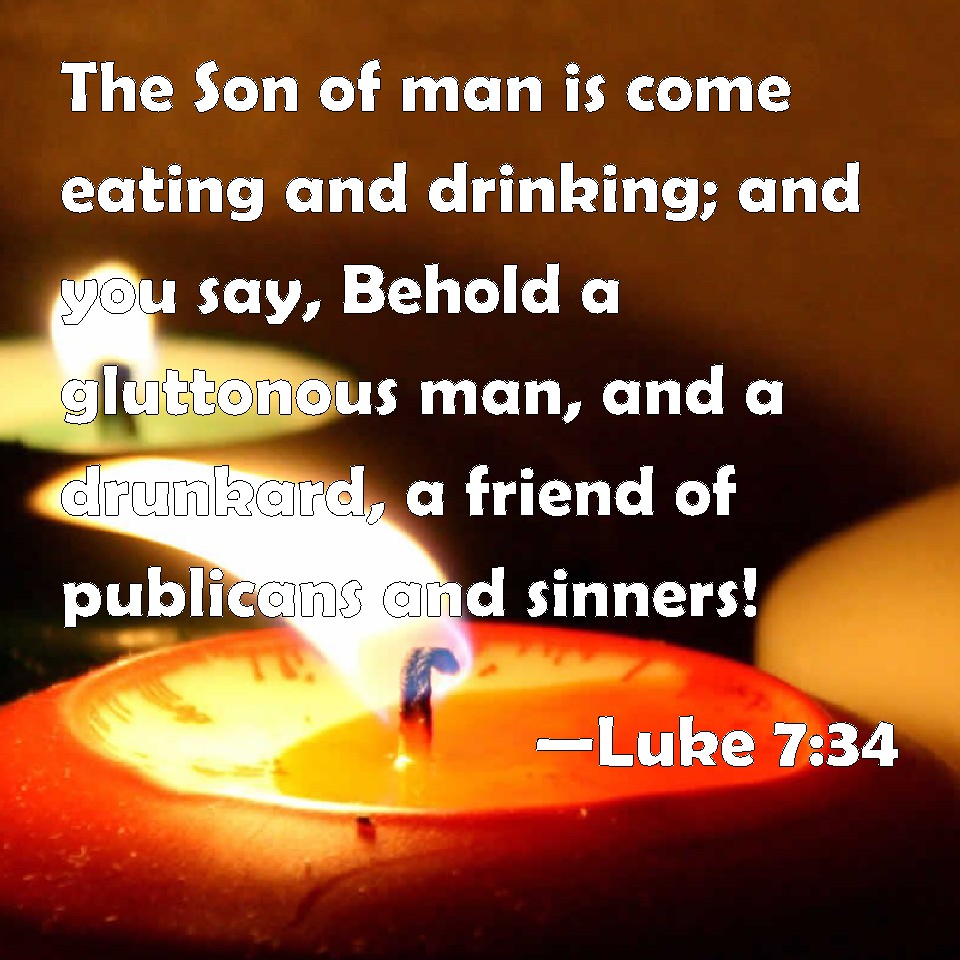 Choose a Background Luke 7:34 The Son of man is come eating and drinking; and you say, Behold a gluttonous man, and a drunkard, a friend of publicans and sinners! KJV: The Son of man is come eating and drinking; and ye say, Behold a gluttonous man, and a winebibber, a friend of publicans and sinners! DRB: The Son of man is come eating and drinking: and you say: Behold a man that is a glutton and a drinker of wine, a friend of publicans and sinners. DBT: The Son of man has come eating and drinking, and ye say, Behold an eater and wine-drinker, a friend of tax-gatherers and sinners; ERV: The Son of man is come eating and drinking; and ye say, Behold, a gluttonous man, and a winebibber, a friend of publicans and sinners! WBT: The Son of man is come eating and drinking; and ye say, Behold, a gluttonous man, and a wine-bibber, a friend of publicans and sinners. WEB: The Son of Man has come eating and drinking, and you say, 'Behold, a gluttonous man, and a drunkard; a friend of tax collectors and sinners!' YLT: the Son of Man came eating and drinking, and ye say, Lo, a man, a glutton, and a wine drinker, a friend of tax-gatherers and sinners;Links Luke 7:34 NIV • Luke 7:34 NLT • Luke 7:34 ESV • Luke 7:34 NASB • Luke 7:34 KJV • Luke 7:34 Interlinear • Luke 7:34 Commentaries • Luke 7:34 Parallel Texts • Luke 7:34 Bible Apps • Luke 7:34 Parallel • Bible Hub |