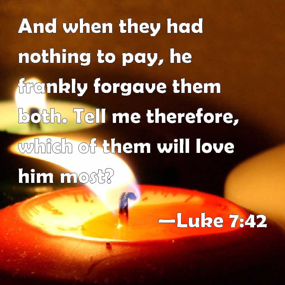 Choose a Background Luke 7:42 And when they had nothing to pay, he frankly forgave them both. Tell me therefore, which of them will love him most? KJV: And when they had nothing to pay, he frankly forgave them both. Tell me therefore, which of them will love him most? DRB: And whereas they had not wherewith to pay, he forgave them both. Which therefore of the two loveth him most? DBT: but as they had nothing to pay, he forgave both of them their debt: say, which of them therefore will love him most? ERV: When they had not wherewith to pay, he forgave them both. Which of them therefore will love him most? WBT: And when they had nothing to pay, he frankly forgave them both. Tell me therefore, which of them will love him most? WEB: When they couldn't pay, he forgave them both. Which of them therefore will love him most?" YLT: and they not having wherewith to give back, he forgave both; which then of them, say thou, will love him more?'Links Luke 7:42 NIV • Luke 7:42 NLT • Luke 7:42 ESV • Luke 7:42 NASB • Luke 7:42 KJV • Luke 7:42 Interlinear • Luke 7:42 Commentaries • Luke 7:42 Parallel Texts • Luke 7:42 Bible Apps • Luke 7:42 Parallel • Bible Hub |