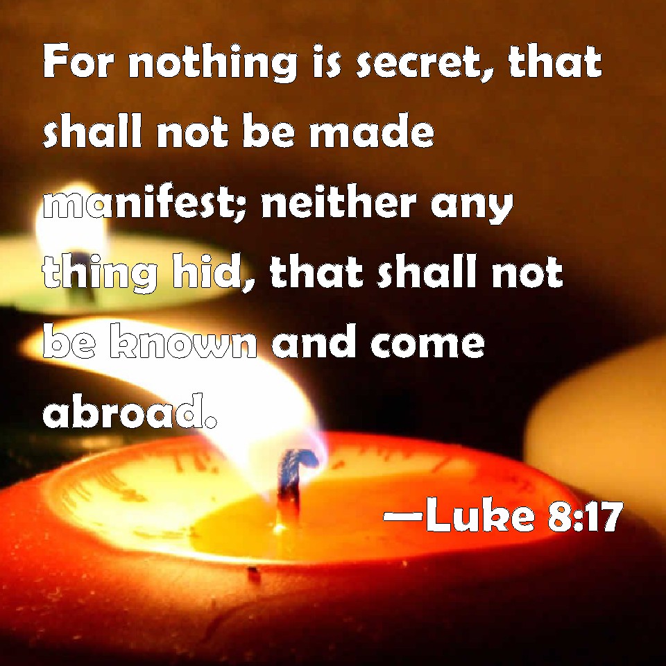 Choose a Background Luke 8:17 For nothing is secret, that shall not be made manifest; neither any thing hid, that shall not be known and come abroad. KJV: For nothing is secret, that shall not be made manifest; neither any thing hid, that shall not be known and come abroad. DRB: For there is not any thing secret that shall not be made manifest, nor hidden, that shall not be known and come abroad. DBT: For there is nothing hid which shall not become manifest, nor secret which shall not be known and come to light. ERV: For nothing is hid, that shall not be made manifest; nor anything secret, that shall not be known and come to light. WBT: For nothing is secret, that shall not be made manifest; neither any thing hid, that shall not be known, and come abroad. WEB: For nothing is hidden, that will not be revealed; nor anything secret, that will not be known and come to light. YLT: for nothing is secret, that shall not become manifest, nor hid, that shall not be known, and become manifest.Links Luke 8:17 NIV • Luke 8:17 NLT • Luke 8:17 ESV • Luke 8:17 NASB • Luke 8:17 KJV • Luke 8:17 Interlinear • Luke 8:17 Commentaries • Luke 8:17 Parallel Texts • Luke 8:17 Bible Apps • Luke 8:17 Parallel • Bible Hub |