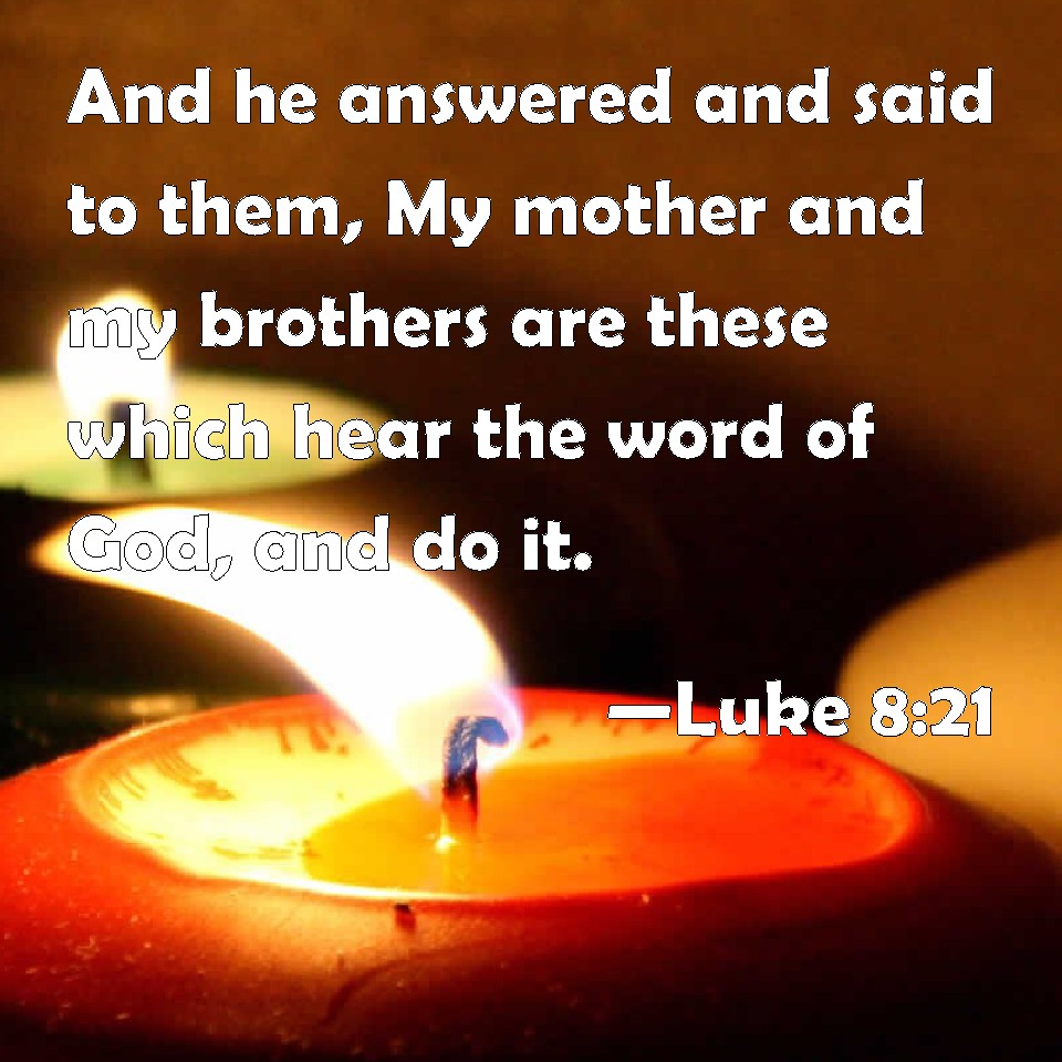 Choose a Background Luke 8:21 And he answered and said to them, My mother and my brothers are these which hear the word of God, and do it. KJV: And he answered and said unto them, My mother and my brethren are these which hear the word of God, and do it. DRB: Who answering, said to them: My mother and my brethren are they who hear the word of God, and do it. DBT: But he answering said to them, My mother and my brethren are those who hear the word of God and do it. ERV: But he answered and said unto them, My mother and my brethren are these which hear the word of God, and do it. WBT: And he answered and said to them, My mother and my brethren are these who hear the word of God, and do it. WEB: But he answered them, "My mother and my brothers are these who hear the word of God, and do it." YLT: and he answering said unto them, 'My mother and my brethren! they are those who the word of God are hearing, and doing.'Links Luke 8:21 NIV • Luke 8:21 NLT • Luke 8:21 ESV • Luke 8:21 NASB • Luke 8:21 KJV • Luke 8:21 Interlinear • Luke 8:21 Commentaries • Luke 8:21 Parallel Texts • Luke 8:21 Bible Apps • Luke 8:21 Parallel • Bible Hub |
