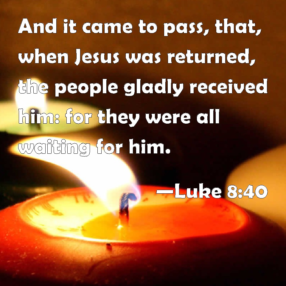 Choose a Background Luke 8:40 And it came to pass, that, when Jesus was returned, the people gladly received him: for they were all waiting for him. KJV: And it came to pass, that, when Jesus was returned, the people gladly received him: for they were all waiting for him. DRB: And it came to pass, that when Jesus was returned, the multitude received him: for they were all waiting for him. DBT: And it came to pass when Jesus returned, the crowd received him gladly, for they were all expecting him. ERV: And as Jesus returned, the multitude welcomed him; for they were all waiting for him. WBT: And it came to pass, that, when Jesus had returned, the people gladly received him: for they were all waiting for him. WEB: It happened, when Jesus returned, that the multitude welcomed him, for they were all waiting for him. YLT: And it came to pass, in the turning back of Jesus, the multitude received him, for they were all looking for him,Links Luke 8:40 NIV • Luke 8:40 NLT • Luke 8:40 ESV • Luke 8:40 NASB • Luke 8:40 KJV • Luke 8:40 Interlinear • Luke 8:40 Commentaries • Luke 8:40 Parallel Texts • Luke 8:40 Bible Apps • Luke 8:40 Parallel • Bible Hub |