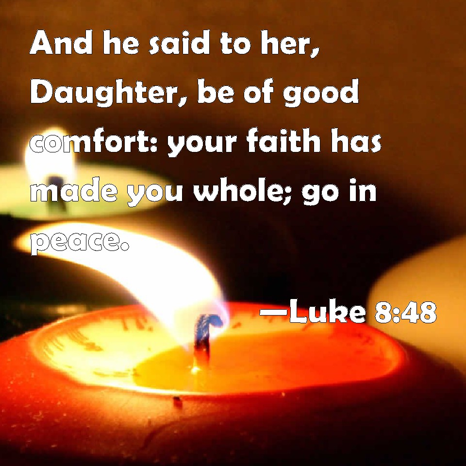 Choose a Background Luke 8:48 And he said to her, Daughter, be of good comfort: your faith has made you whole; go in peace. KJV: And he said unto her, Daughter, be of good comfort: thy faith hath made thee whole; go in peace. DRB: But he said to her: Daughter, thy faith hath made thee whole; go thy way in peace. DBT: And he said to her, Be of good courage, daughter; thy faith has healed thee; go in peace. ERV: And he said unto her, Daughter, thy faith hath made thee whole; go in peace. WBT: And he said to her, Daughter, be of good comfort: thy faith hath made thee whole; go in peace. WEB: He said to her, "Daughter, cheer up. Your faith has made you well. Go in peace." YLT: and he said to her, 'Take courage, daughter, thy faith hath saved thee, be going on to peace.'Links Luke 8:48 NIV • Luke 8:48 NLT • Luke 8:48 ESV • Luke 8:48 NASB • Luke 8:48 KJV • Luke 8:48 Interlinear • Luke 8:48 Commentaries • Luke 8:48 Parallel Texts • Luke 8:48 Bible Apps • Luke 8:48 Parallel • Bible Hub |