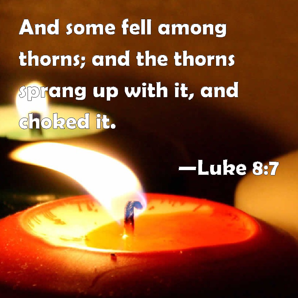 Choose a Background Luke 8:7 And some fell among thorns; and the thorns sprang up with it, and choked it. KJV: And some fell among thorns; and the thorns sprang up with it, and choked it. DRB: And other some fell among thorns, and the thorns growing up with it, choked it. DBT: and other fell in the midst of the thorns, and the thorns having sprung up with it choked it; ERV: And other fell amidst the thorns; and the thorns grew with it, and choked it. WBT: And some fell among thorns; and the thorns sprang up with it, and choked it. WEB: Other fell amid the thorns, and the thorns grew with it, and choked it. YLT: 'And other fell amidst the thorns, and the thorns having sprung up with it, did choke it.Links Luke 8:7 NIV • Luke 8:7 NLT • Luke 8:7 ESV • Luke 8:7 NASB • Luke 8:7 KJV • Luke 8:7 Interlinear • Luke 8:7 Commentaries • Luke 8:7 Parallel Texts • Luke 8:7 Bible Apps • Luke 8:7 Parallel • Bible Hub |