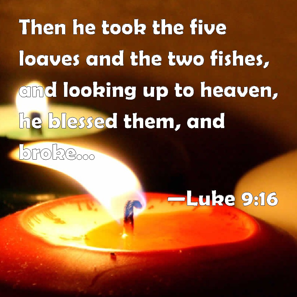 Choose a Background Luke 9:16 Then he took the five loaves and the two fishes, and looking up to heaven, he blessed them, and broke, and gave to the disciples to set before the multitude. KJV: Then he took the five loaves and the two fishes, and looking up to heaven, he blessed them, and brake, and gave to the disciples to set before the multitude. DRB: And taking the five loaves and the two fishes, he looked up to heaven, and blessed them; and he broke, and distributed to his disciples, to set before the multitude. DBT: And taking the five loaves and the two fishes, looking up to heaven he blessed them, and broke and gave to the disciples to set before the crowd. ERV: And he took the five loaves and the two fishes, and looking up to heaven, he blessed them, and brake; and gave to the disciples to set before the multitude. WBT: Then he took the five loaves, and the two fishes, and looking up to heaven, he blessed them, and broke, and gave to the disciples to set before the multitude. WEB: He took the five loaves and the two fish, and looking up to the sky, he blessed them, and broke them, and gave them to the disciples to set before the multitude. YLT: and having taken the five loaves, and the two fishes, having looked up to the heaven, he blessed them, and brake, and was giving to the disciples to set before the multitude;Links Luke 9:16 NIV • Luke 9:16 NLT • Luke 9:16 ESV • Luke 9:16 NASB • Luke 9:16 KJV • Luke 9:16 Interlinear • Luke 9:16 Commentaries • Luke 9:16 Parallel Texts • Luke 9:16 Bible Apps • Luke 9:16 Parallel • Bible Hub |
