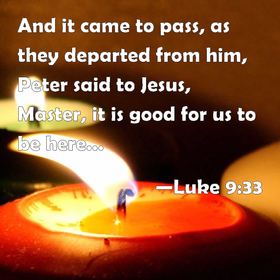 Choose a Background Luke 9:33 And it came to pass, as they departed from him, Peter said to Jesus, Master, it is good for us to be here: and let us make three tabernacles; one for you, and one for Moses, and one for Elias: not knowing what he said. KJV: And it came to pass, as they departed from him, Peter said unto Jesus, Master, it is good for us to be here: and let us make three tabernacles; one for thee, and one for Moses, and one for Elias: not knowing what he said. DRB: And it came to pass, that as they were departing from him, Peter saith to Jesus: Master, it is good for us to be here; and let us make three tabernacles, one for thee, and one for Moses, and one for Elias; not knowing what he said. DBT: And it came to pass as they departed from him, Peter said to Jesus, Master, it is good for us to be here; and let us make three tabernacles, one for thee, and one for Moses, and one for Elias: not knowing what he said. ERV: And it came to pass, as they were parting from him, Peter said unto Jesus, Master, it is good for us to be here: and let us make three tabernacles; one for thee, and one for Moses, and one for Elijah: not knowing what he said. WBT: And it came to pass, as they departed from him, Peter said to Jesus, Master, it is good for us to be here: and let us make three tabernacles; one for thee, and one for Moses, and one for Elijah: not knowing what he said. WEB: It happened, as they were parting from him, that Peter said to Jesus, "Master, it is good for us to be here. Let's make three tents: one for you, and one for Moses, and one for Elijah," not knowing what he said. YLT: And it came to pass, in their parting from him, Peter said unto Jesus, 'Master, it is good to us to be here; and we may make three booths, one for thee, and one for Moses, and one for Elijah,' not knowing what he saith:Links Luke 9:33 NIV • Luke 9:33 NLT • Luke 9:33 ESV • Luke 9:33 NASB • Luke 9:33 KJV • Luke 9:33 Interlinear • Luke 9:33 Commentaries • Luke 9:33 Parallel Texts • Luke 9:33 Bible Apps • Luke 9:33 Parallel • Bible Hub |