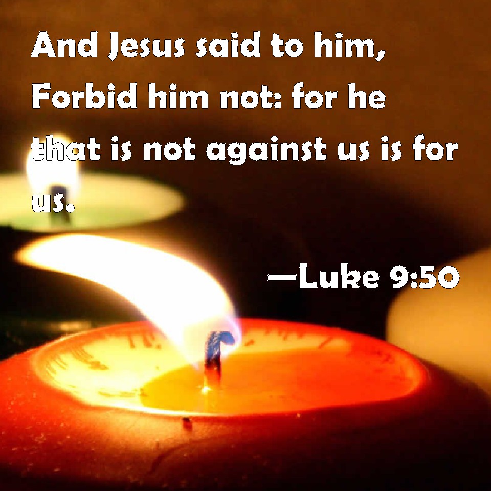 Choose a Background Luke 9:50 And Jesus said to him, Forbid him not: for he that is not against us is for us. KJV: And Jesus said unto him, Forbid him not: for he that is not against us is for us. DRB: And Jesus said to him: Forbid him not; for he that is not against you, is for you. DBT: And Jesus said to him, Forbid him not, for he that is not against you is for you. ERV: But Jesus said unto him, Forbid him not: for he that is not against you is for you. WBT: And Jesus said to him, Forbid him not: for he that is not against us, is for us. WEB: Jesus said to him, "Don't forbid him, for he who is not against us is for us." YLT: and Jesus said unto him, 'Forbid not, for he who is not against us, is for us.'Links Luke 9:50 NIV • Luke 9:50 NLT • Luke 9:50 ESV • Luke 9:50 NASB • Luke 9:50 KJV • Luke 9:50 Interlinear • Luke 9:50 Commentaries • Luke 9:50 Parallel Texts • Luke 9:50 Bible Apps • Luke 9:50 Parallel • Bible Hub |