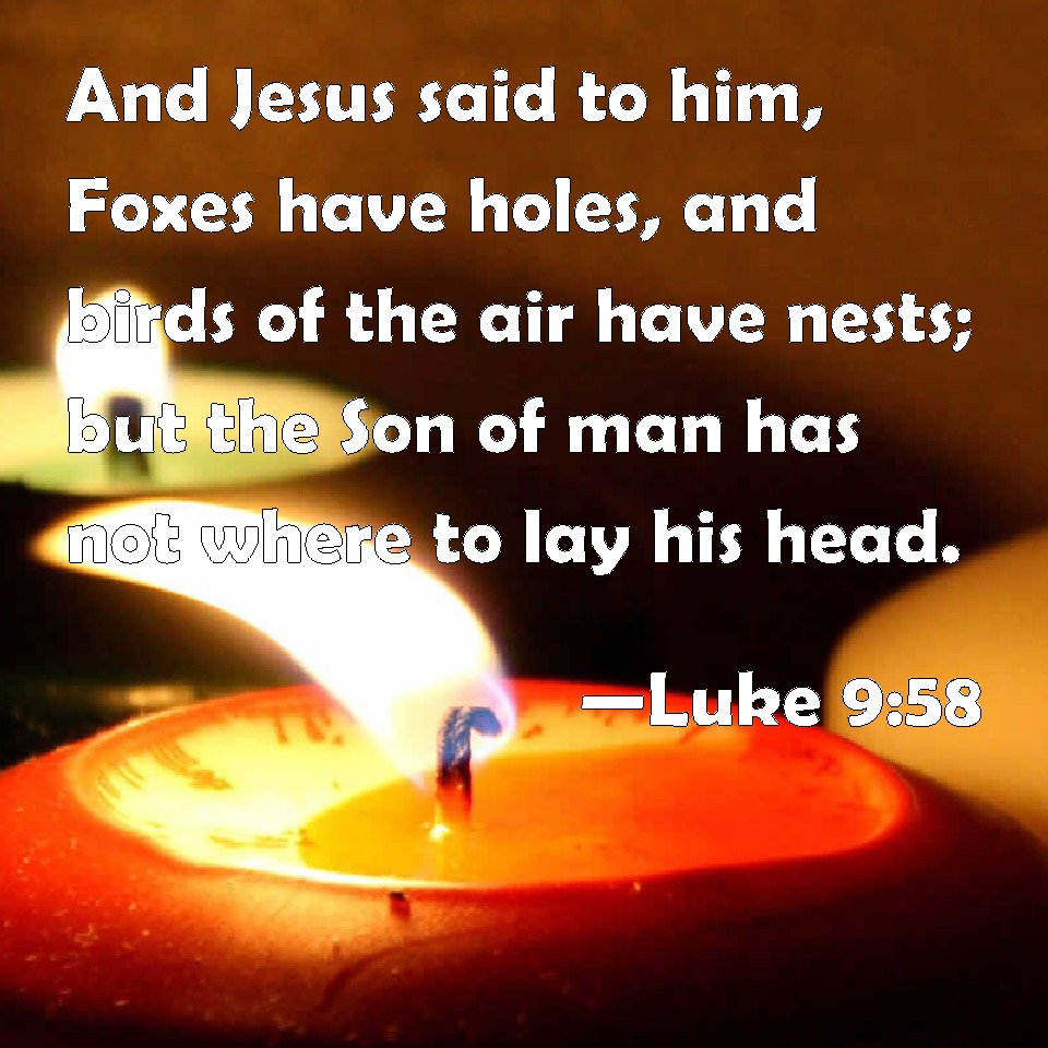 Choose a Background Luke 9:58 And Jesus said to him, Foxes have holes, and birds of the air have nests; but the Son of man has not where to lay his head. KJV: And Jesus said unto him, Foxes have holes, and birds of the air have nests; but the Son of man hath not where to lay his head. DRB: Jesus said to him: The foxes have holes, and the birds of the air nests; but the Son of man hath not where to lay his head. DBT: And Jesus said to him, The foxes have holes and the birds of the heaven roosting-places, but the Son of man has not where he may lay his head. ERV: And Jesus said unto him, The foxes have holes, and the birds of the heaven have nests; but the Son of man hath not where to lay his head. WBT: And Jesus said to him, Foxes have holes, and birds of the air have nests; but the Son of man hath not where to lay his head. WEB: Jesus said to him, "The foxes have holes, and the birds of the sky have nests, but the Son of Man has no place to lay his head." YLT: and Jesus said to him, 'The foxes have holes, and the fowls of the heaven places of rest, but the Son of Man hath not where he may recline the head.'Links Luke 9:58 NIV • Luke 9:58 NLT • Luke 9:58 ESV • Luke 9:58 NASB • Luke 9:58 KJV • Luke 9:58 Interlinear • Luke 9:58 Commentaries • Luke 9:58 Parallel Texts • Luke 9:58 Bible Apps • Luke 9:58 Parallel • Bible Hub |