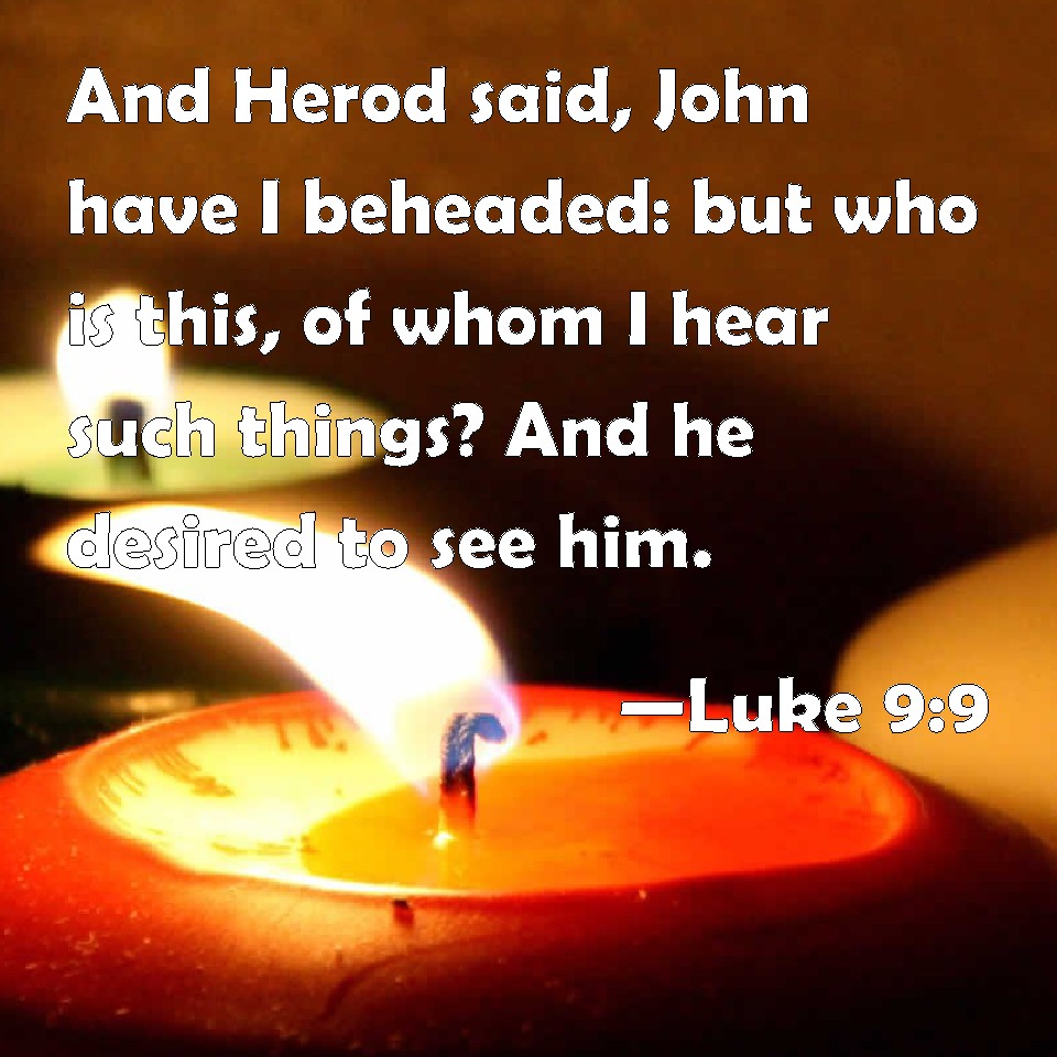 Choose a Background Luke 9:9 And Herod said, John have I beheaded: but who is this, of whom I hear such things? And he desired to see him. KJV: And Herod said, John have I beheaded: but who is this, of whom I hear such things? And he desired to see him. DRB: And Herod said: John I have beheaded; but who is this of whom I hear such things? And he sought to see him. DBT: And Herod said, John I have beheaded, but who is this of whom I hear such things? and he sought to see him. ERV: And Herod said, John I beheaded: but who is this, about whom I hear such things? And he sought to see him. WBT: And Herod said, John have I beheaded; but who is this of whom I hear such things? And he desired to see him. WEB: Herod said, "John I beheaded, but who is this, about whom I hear such things?" He sought to see him. YLT: and Herod said, 'John I did behead, but who is this concerning whom I hear such things?' and he was seeking to see him.Links Luke 9:9 NIV • Luke 9:9 NLT • Luke 9:9 ESV • Luke 9:9 NASB • Luke 9:9 KJV • Luke 9:9 Interlinear • Luke 9:9 Commentaries • Luke 9:9 Parallel Texts • Luke 9:9 Bible Apps • Luke 9:9 Parallel • Bible Hub |