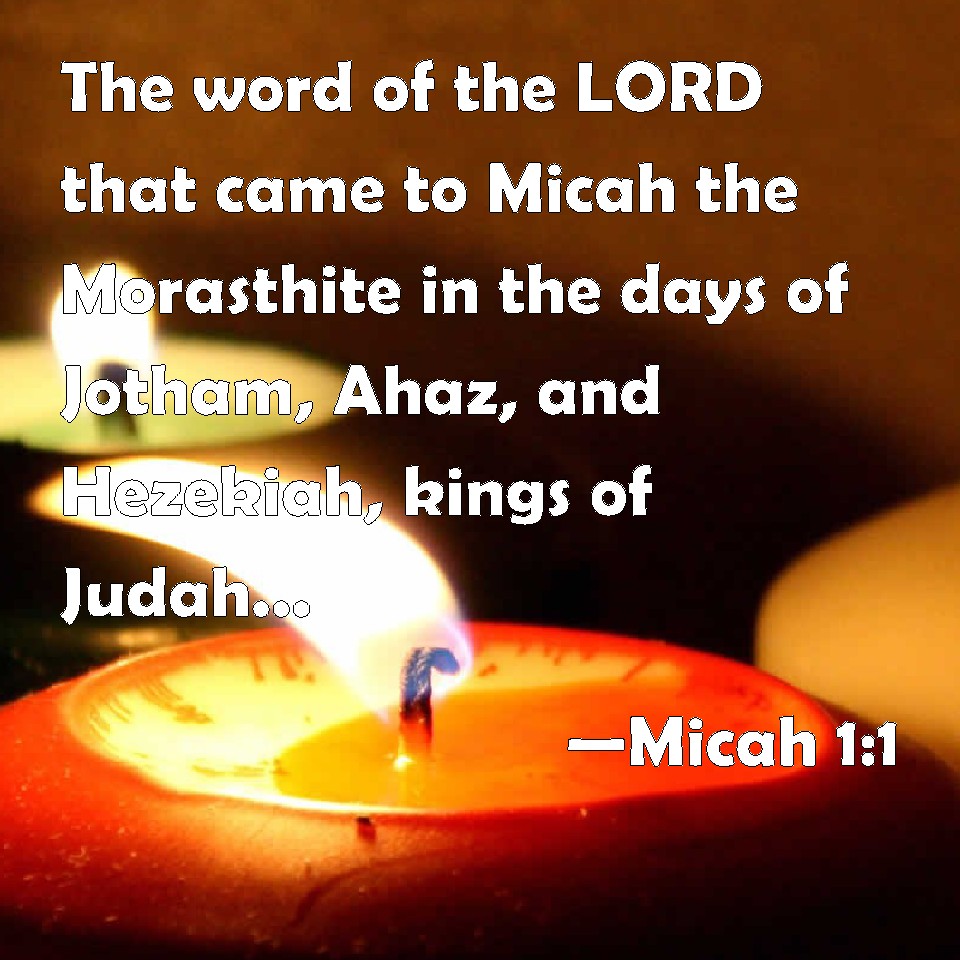 Choose a Background Micah 1:1 The word of the LORD that came to Micah the Morasthite in the days of Jotham, Ahaz, and Hezekiah, kings of Judah, which he saw concerning Samaria and Jerusalem. KJV: The word of the LORD that came to Micah the Morasthite in the days of Jotham, Ahaz, and Hezekiah, kings of Judah, which he saw concerning Samaria and Jerusalem. DRB: The word of the Lord that came to Micheas the Morasthite, in the days of Joathan, Achaz, and Ezechias, kings of Juda: which he saw concerning Samaria and Jerusalem. DBT: The word of Jehovah that came to Micah the Morasthite in the days of Jotham, Ahaz, and Hezekiah, kings of Judah, which he saw concerning Samaria and Jerusalem. ERV: The word of the LORD that came to Micah the Morashtite in the days of Jotham, Ahaz, and Hezekiah, kings of Judah, which he saw concerning Samaria and Jerusalem. WBT: The word of the LORD that came to Micah the Morasthite in the days of Jotham, Ahaz, and Hezekiah, kings of Judah, which he saw concerning Samaria and Jerusalem. WEB: The word of Yahweh that came to Micah the Morashtite in the days of Jotham, Ahaz, and Hezekiah, kings of Judah, which he saw concerning Samaria and Jerusalem. YLT: A word of Jehovah that hath been unto Micah the Morashite in the days of Jotham, Ahaz, Hezekiah, kings of Judah, that he hath seen concerning Samaria and Jerusalem:Links Micah 1:1 NIV • Micah 1:1 NLT • Micah 1:1 ESV • Micah 1:1 NASB • Micah 1:1 KJV • Micah 1:1 Interlinear • Micah 1:1 Commentaries • Micah 1:1 Parallel Texts • Micah 1:1 Bible Apps • Micah 1:1 Parallel • Bible Hub |