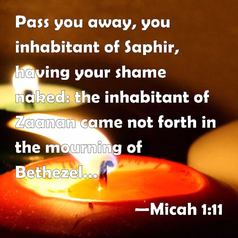 Choose a Background Micah 1:11 Pass you away, you inhabitant of Saphir, having your shame naked: the inhabitant of Zaanan came not forth in the mourning of Bethezel; he shall receive of you his standing. KJV: Pass ye away, thou inhabitant of Saphir, having thy shame naked: the inhabitant of Zaanan came not forth in the mourning of Bethezel; he shall receive of you his standing. DRB: And pass away, O thou that dwellest in the Beautiful place, covered with thy shame: she went not forth that dwelleth in the confines: the House adjoining shall receive mourning from you, which stood by herself. DBT: Pass away, inhabitress of Shaphir, in nakedness and shame. The inhabitress of Zaanan is not come forth for the lamentation of Beth-ezel: he will take from you its shelter. ERV: Pass ye away, O inhabitant of Shaphir, in nakedness and shame: the inhabitant of Zaanan is not come forth; the wailing of Beth-ezel shall take from you the stay thereof. WBT: Pass ye away, thou inhabitant of Saphir, having thy shame exposed: the inhabitant of Zaanan came not forth in the mourning of Beth-ezel; he shall receive from you his standing. WEB: Pass on, inhabitant of Shaphir, in nakedness and shame. The inhabitant of Zaanan won't come out. The wailing of Beth Ezel will take from you his protection. YLT: Pass over for thee, O inhabitant of Shaphir, Naked one of shame. Not gone out hath the inhabitant of Zaanan, The lamentation of Beth-Ezel doth take from you its standing.Links Micah 1:11 NIV • Micah 1:11 NLT • Micah 1:11 ESV • Micah 1:11 NASB • Micah 1:11 KJV • Micah 1:11 Interlinear • Micah 1:11 Commentaries • Micah 1:11 Parallel Texts • Micah 1:11 Bible Apps • Micah 1:11 Parallel • Bible Hub |