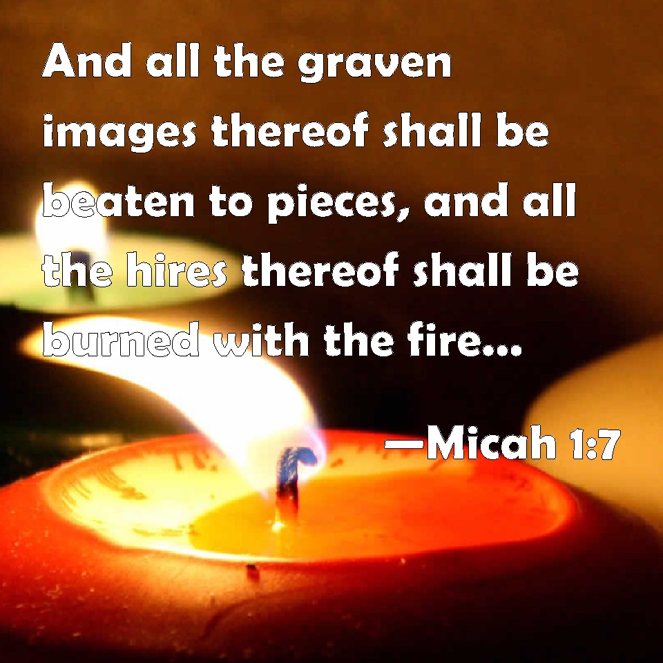 Choose a Background Micah 1:7 And all the graven images thereof shall be beaten to pieces, and all the hires thereof shall be burned with the fire, and all the idols thereof will I lay desolate: for she gathered it of the hire of an harlot, and they shall return to the hire of an harlot. KJV: And all the graven images thereof shall be beaten to pieces, and all the hires thereof shall be burned with the fire, and all the idols thereof will I lay desolate: for she gathered it of the hire of an harlot, and they shall return to the hire of an harlot. DRB: And all her graven things shall be cut in pieces, and all her wages shall be burnt with fire, and I will bring to destruction all her idols: for they were gathered together of the hire of a harlot, and unto the hire of a harlot they shall return. DBT: And all her graven images shall be beaten to pieces, and all her harlot-gifts shall be burned with fire, and all her idols will I make a desolation; for of the hire of a harlot hath she gathered them, and to a harlot's hire shall they return. ERV: And all her graven images shall be beaten to pieces, and all her hires shall be burned with fire, and all her idols will I lay desolate: for of the hire of an harlot hath she gathered them, and unto the hire of an harlot shall they return. WBT: And all her graven images shall be beaten to pieces, and all her hires shall be burned with the fire, and all her idols will I lay desolate: for she gathered it from the hire of a harlot, and they shall return to the hire of a harlot. WEB: All her idols will be beaten to pieces, and all her temple gifts will be burned with fire, and all her images I will destroy; for of the hire of a prostitute has she gathered them, and to the hire of a prostitute shall they return." YLT: And all her graven images are beaten down, And all her gifts are burnt with fire, And all her idols I make a desolation, For, from the hire of a harlot she gathered, and unto the hire of a harlot they return.Links Micah 1:7 NIV • Micah 1:7 NLT • Micah 1:7 ESV • Micah 1:7 NASB • Micah 1:7 KJV • Micah 1:7 Interlinear • Micah 1:7 Commentaries • Micah 1:7 Parallel Texts • Micah 1:7 Bible Apps • Micah 1:7 Parallel • Bible Hub |