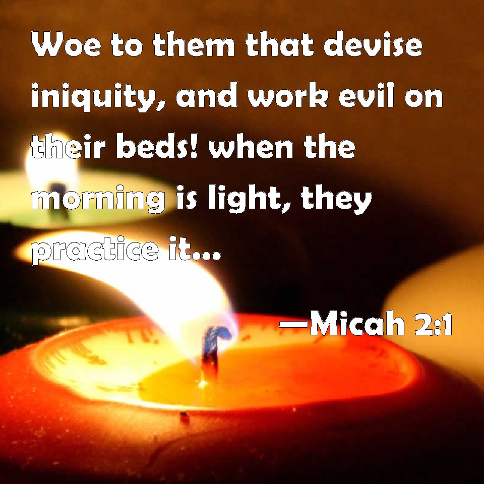 Choose a Background Micah 2:1 Woe to them that devise iniquity, and work evil on their beds! when the morning is light, they practice it, because it is in the power of their hand. KJV: Woe to them that devise iniquity, and work evil upon their beds! when the morning is light, they practise it, because it is in the power of their hand. DRB: Woe to you that devise that which is unprofitable, and work evil in your beds: in the morning light they execute it, because their hand is against God. DBT: Woe to them that devise iniquity and work evil upon their beds! When the morning is light they practise it, because it is in the power of their hand. ERV: Woe to them that devise iniquity and work evil upon their beds! when the morning is light, they practise it, because it is in the power of their hand. WBT: Woe to them that devise iniquity, and work evil upon their beds! when the morning is light, they practice it, because it is in the power of their hand. WEB: Woe to those who devise iniquity and work evil on their beds! When the morning is light, they practice it, because it is in the power of their hand. YLT: Woe to those devising iniquity, And working evil on their beds, In the light of the morning they do it, For their hand is — to God.Links Micah 2:1 NIV • Micah 2:1 NLT • Micah 2:1 ESV • Micah 2:1 NASB • Micah 2:1 KJV • Micah 2:1 Interlinear • Micah 2:1 Commentaries • Micah 2:1 Parallel Texts • Micah 2:1 Bible Apps • Micah 2:1 Parallel • Bible Hub |