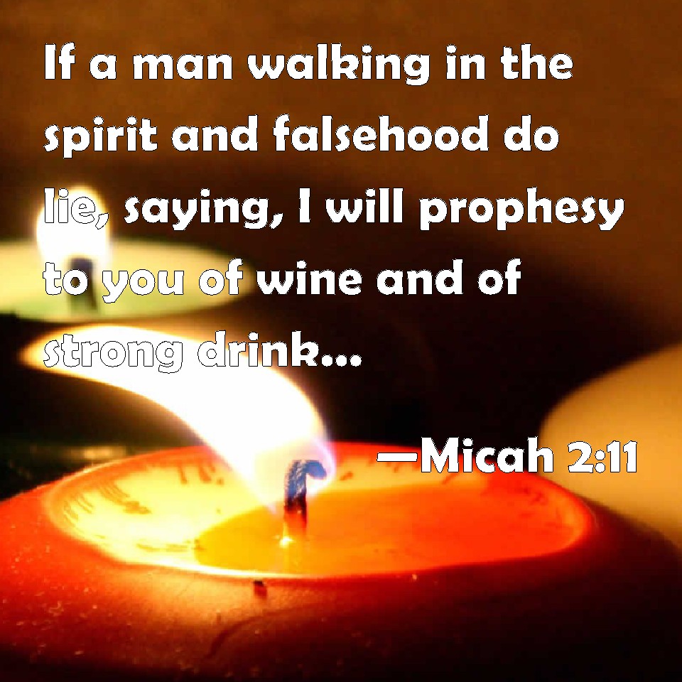 Choose a Background Micah 2:11 If a man walking in the spirit and falsehood do lie, saying, I will prophesy to you of wine and of strong drink; he shall even be the prophet of this people. KJV: If a man walking in the spirit and falsehood do lie, saying, I will prophesy unto thee of wine and of strong drink; he shall even be the prophet of this people. DRB: Would God I were not a man that hath the spirit, and that I rather spoke a lie: I will let drop to thee of wine, and of drunkenness: and it shall be this people upon whom it shall drop. DBT: If a man walking in wind and falsehood do lie, saying, I will prophesy unto thee of wine and of strong drink, he shall be the prophet of this people. ERV: If a man walking in wind and falsehood do lie, saying, I will prophesy unto thee of wine and of strong drink; he shall even be the prophet of this people. WBT: If a man walking in the spirit and falsehood doth lie, saying, I will prophesy to thee of wine and of strong drink; he shall even be the prophet of this people. WEB: If a man walking in a spirit of falsehood lies: "I will prophesy to you of wine and of strong drink;" he would be the prophet of this people. YLT: If one is going with the wind, And with falsehood hath lied: 'I prophesy to thee of wine, and of strong drink,' He hath been the prophet of this people!Links Micah 2:11 NIV • Micah 2:11 NLT • Micah 2:11 ESV • Micah 2:11 NASB • Micah 2:11 KJV • Micah 2:11 Interlinear • Micah 2:11 Commentaries • Micah 2:11 Parallel Texts • Micah 2:11 Bible Apps • Micah 2:11 Parallel • Bible Hub |