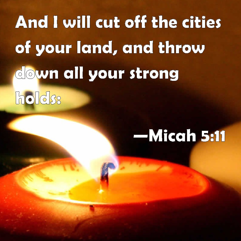 Choose a Background Micah 5:11 And I will cut off the cities of your land, and throw down all your strong holds: KJV: And I will cut off the cities of thy land, and throw down all thy strong holds: DRB: And I will destroy the cities of thy land, and will throw down all thy strong holds, DBT: And I will cut off the cities of thy land, and overthrow all thy strongholds. ERV: and I will cut off the cities of thy land, and will throw down all thy strong holds: WBT: And I will cut off the cities of thy land, and throw down all thy strong holds: WEB: I will cut off the cities of your land, and will tear down all your strongholds. YLT: And I have cut off the cities of thy land, And I have thrown down all thy fortresses,Links Micah 5:11 NIV • Micah 5:11 NLT • Micah 5:11 ESV • Micah 5:11 NASB • Micah 5:11 KJV • Micah 5:11 Interlinear • Micah 5:11 Commentaries • Micah 5:11 Parallel Texts • Micah 5:11 Bible Apps • Micah 5:11 Parallel • Bible Hub |