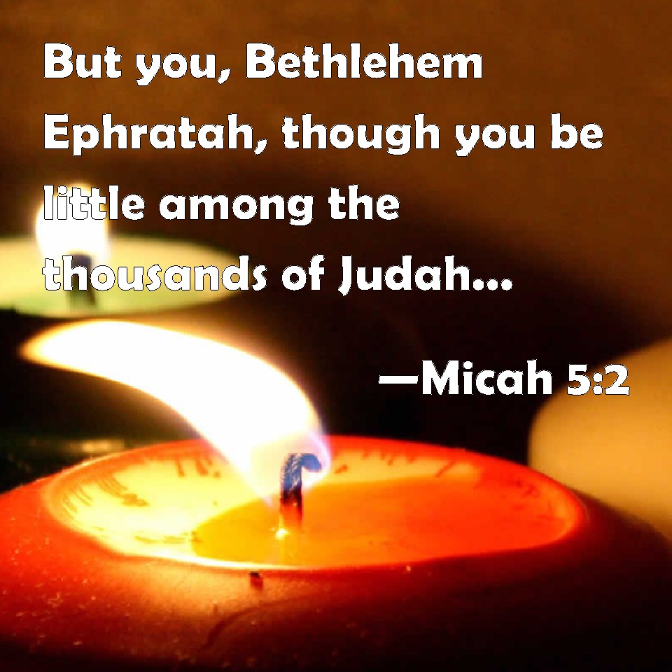 Choose a Background Micah 5:2 But you, Bethlehem Ephratah, though you be little among the thousands of Judah, yet out of you shall he come forth to me that is to be ruler in Israel; whose goings forth have been from of old, from everlasting. KJV: But thou, Bethlehem Ephratah, though thou be little among the thousands of Judah, yet out of thee shall he come forth unto me that is to be ruler in Israel; whose goings forth have been from of old, from everlasting. DRB: AND THOU, BETHLEHEM Ephrata, art a little one among the thousands of Juda: out of thee shall he come forth unto me that is to be the ruler in Israel: and his going forth is from the beginning, from the days of eternity. DBT: (And thou, Bethlehem Ephratah, little to be among the thousands of Judah, out of thee shall he come forth unto me who is to be Ruler in Israel: whose goings forth are from of old, from the days of eternity.) ERV: But thou, Beth-lehem Ephrathah, which art little to be among the thousands of Judah, out of thee shall one come forth unto me that is to be ruler in Israel; whose goings forth are from of old, from everlasting. WBT: But thou, Beth-lehem Ephratah, though thou art little among the thousands of Judah, yet out of thee shall he come forth to me that is to be ruler in Israel; whose goings forth have been from of old, from everlasting. WEB: But you, Bethlehem Ephrathah, being small among the clans of Judah, out of you one will come forth to me that is to be ruler in Israel; whose goings forth are from of old, from everlasting. YLT: And thou, Beth-Lehem Ephratah, Little to be among the chiefs of Judah! From thee to Me he cometh forth — to be ruler in Israel, And his comings forth are of old, From the days of antiquity.Links Micah 5:2 NIV • Micah 5:2 NLT • Micah 5:2 ESV • Micah 5:2 NASB • Micah 5:2 KJV • Micah 5:2 Interlinear • Micah 5:2 Commentaries • Micah 5:2 Parallel Texts • Micah 5:2 Bible Apps • Micah 5:2 Parallel • Bible Hub |