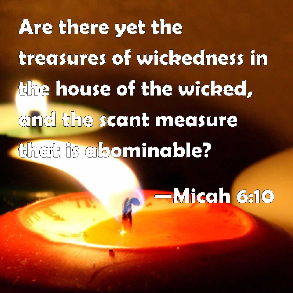 Micah 6:10 Are there yet the treasures of wickedness in the house of the wicked, and the scant measure that is abominable?