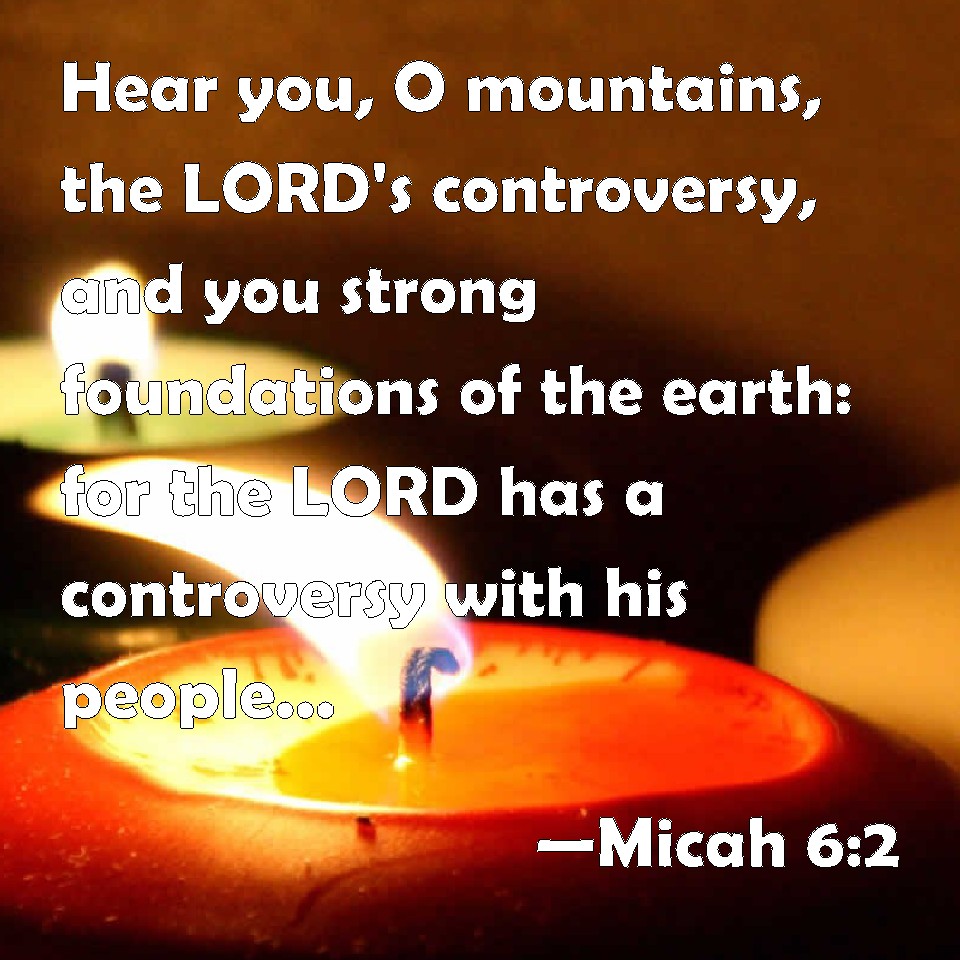 Choose a Background Micah 6:2 Hear you, O mountains, the LORD's controversy, and you strong foundations of the earth: for the LORD has a controversy with his people, and he will plead with Israel. KJV: Hear ye, O mountains, the LORD'S controversy, and ye strong foundations of the earth: for the LORD hath a controversy with his people, and he will plead with Israel. DRB: Let the mountains hear the judgment of the Lord, and the strong foundations of the earth: for the Lord will enter into judgment with his people, and he will plead against Israel. DBT: Hear, ye mountains, Jehovah's controversy, and ye, unchanging foundations of the earth; for Jehovah hath a controversy with his people, and he will plead with Israel. ERV: Hear, O ye mountains, the LORD'S controversy, and ye enduring foundations of the earth: for the LORD hath a controversy with his people, and he will plead with Israel. WBT: Hear ye, O mountains, the LORD'S controversy, and ye strong foundations of the earth: for the LORD hath a controversy with his people, and he will plead with Israel. WEB: Hear, you mountains, Yahweh's controversy, and you enduring foundations of the earth; for Yahweh has a controversy with his people, and he will contend with Israel. YLT: Hear, O mountains, the strife of Jehovah, Ye strong ones — foundations of earth! For a strife is to Jehovah, with His people, And with Israel He doth reason.Links Micah 6:2 NIV • Micah 6:2 NLT • Micah 6:2 ESV • Micah 6:2 NASB • Micah 6:2 KJV • Micah 6:2 Interlinear • Micah 6:2 Commentaries • Micah 6:2 Parallel Texts • Micah 6:2 Bible Apps • Micah 6:2 Parallel • Bible Hub |