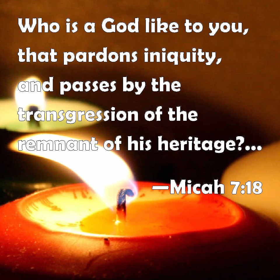 Choose a Background Micah 7:18 Who is a God like to you, that pardons iniquity, and passes by the transgression of the remnant of his heritage? he retains not his anger for ever, because he delights in mercy. KJV: Who is a God like unto thee, that pardoneth iniquity, and passeth by the transgression of the remnant of his heritage? he retaineth not his anger for ever, because he delighteth in mercy. DRB: Who is a God like to thee, who takest away iniquity, and passest by the sin of the remnant of thy inheritance? he will send his fury in no more, because he delighteth in mercy. DBT: Who is a God like unto thee, that forgiveth iniquity, and passeth by the transgression of the remnant of his heritage? He retaineth not his anger for ever, because he delighteth in loving-kindness. ERV: Who is a God like unto thee, that pardoneth iniquity, and passeth by the transgression of the remnant of his heritage? he retaineth not his anger for ever, because he delighteth in mercy. WBT: Who is a God like to thee, that pardoneth iniquity, and passeth by the transgression of the remnant of his heritage? he retaineth not his anger for ever, because he delighteth in mercy. WEB: Who is a God like you, who pardons iniquity, and passes over the disobedience of the remnant of his heritage? He doesn't retain his anger forever, because he delights in loving kindness. YLT: Who is a God like Thee? taking away iniquity, And passing by the transgression of the remnant of His inheritance, He hath not retained for ever His anger, Because He — He delighteth in kindness.Links Micah 7:18 NIV • Micah 7:18 NLT • Micah 7:18 ESV • Micah 7:18 NASB • Micah 7:18 KJV • Micah 7:18 Interlinear • Micah 7:18 Commentaries • Micah 7:18 Parallel Texts • Micah 7:18 Bible Apps • Micah 7:18 Parallel • Bible Hub |