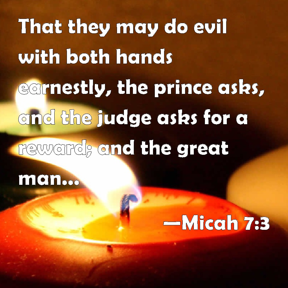 Choose a Background Micah 7:3 That they may do evil with both hands earnestly, the prince asks, and the judge asks for a reward; and the great man, he utters his mischievous desire: so they wrap it up. KJV: That they may do evil with both hands earnestly, the prince asketh, and the judge asketh for a reward; and the great man, he uttereth his mischievous desire: so they wrap it up. DRB: The evil of their hands they call good: the prince requireth, and the judge is for giving: and the great man hath uttered the desire of his soul, and they have troubled it. DBT: Both hands are for evil, to do it well. The prince asketh, and the judge is there for a reward; and the great man uttereth his soul's greed: and together they combine it. ERV: Their hands are upon that which is evil to do it diligently; the prince asketh, and the judge is ready for a reward; and the great man, he uttereth the mischief of his soul: thus they weave it together. WBT: That they may do evil with both hands earnestly, the prince asketh, and the judge asketh for a reward; and the great man, he uttereth his mischievous desire: so they wrap it up. WEB: Their hands are on that which is evil to do it diligently. The ruler and judge ask for a bribe; and the powerful man dictates the evil desire of his soul. Thus they conspire together. YLT: On the evil are both hands to do it well, The prince is asking — also the judge — for recompence, And the great — he is speaking the mischief of his soul, And they wrap it up.Links Micah 7:3 NIV • Micah 7:3 NLT • Micah 7:3 ESV • Micah 7:3 NASB • Micah 7:3 KJV • Micah 7:3 Interlinear • Micah 7:3 Commentaries • Micah 7:3 Parallel Texts • Micah 7:3 Bible Apps • Micah 7:3 Parallel • Bible Hub |