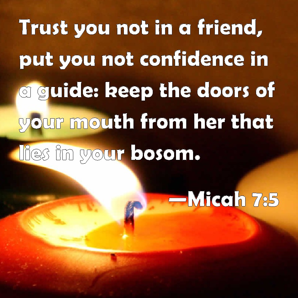 Micah 7:5 Trust you not in a friend, put you not confidence in a guide: keep the doors of your mouth from her that lies in your bosom.
