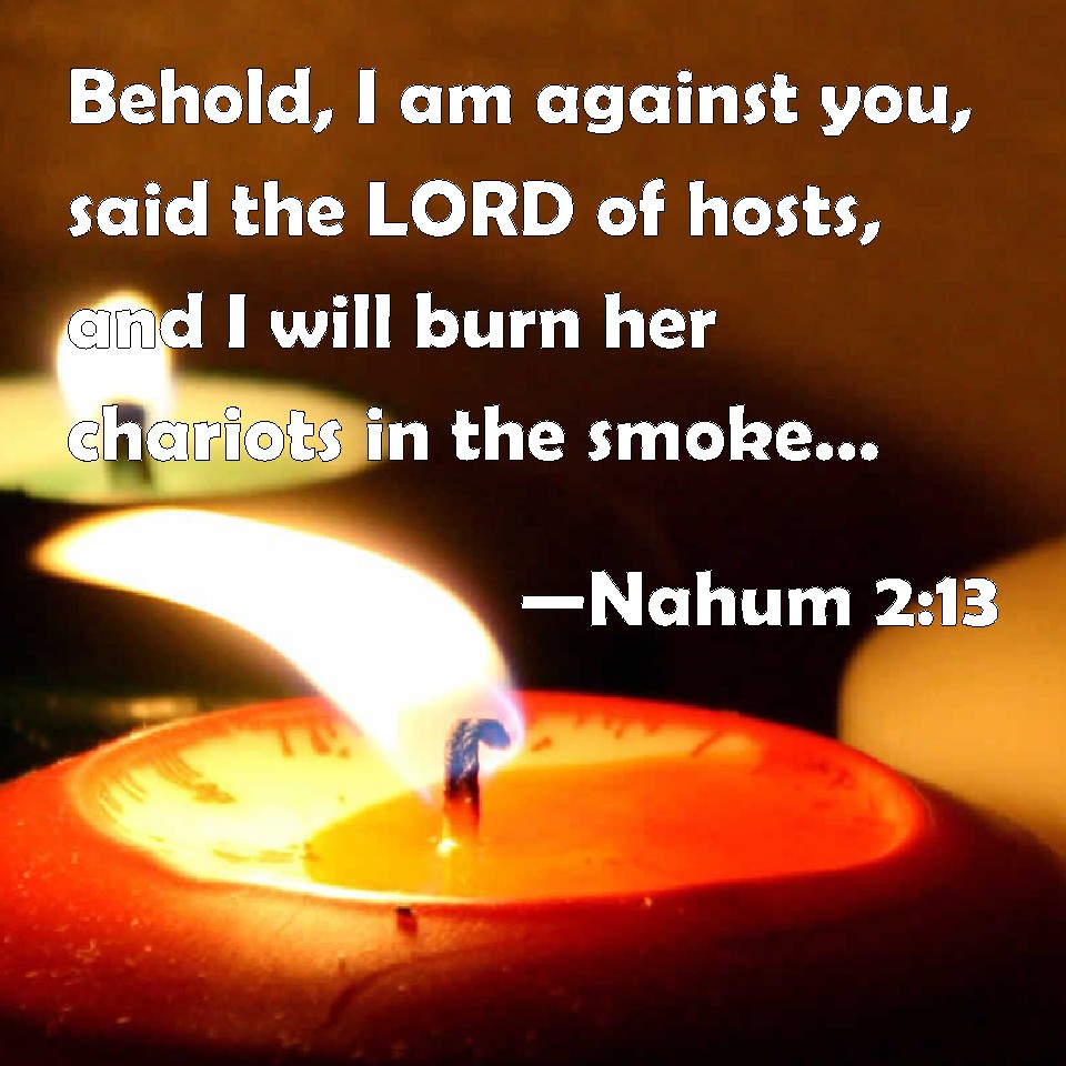 Choose a Background Nahum 2:13 Behold, I am against you, said the LORD of hosts, and I will burn her chariots in the smoke, and the sword shall devour your young lions: and I will cut off your prey from the earth, and the voice of your messengers shall no more be heard. KJV: Behold, I am against thee, saith the LORD of hosts, and I will burn her chariots in the smoke, and the sword shall devour thy young lions: and I will cut off thy prey from the earth, and the voice of thy messengers shall no more be heard. DRB: Behold I come against thee, saith the Lord of hosts, and I will burn thy chariots even to smoke, and the sword shall devour thy young lions: and I will cut off thy prey out of the land, and the voice of thy messengers shall be heard no more. DBT: Behold, I am against thee, saith Jehovah of hosts: and I will burn her chariots into smoke; and the sword shall devour thy young lions, and I will cut off thy prey from the earth; and the voice of thy messengers shall no more be heard. ERV: Behold, I am against thee, saith the LORD of hosts, and I will burn her chariots in the smoke, and the sword shall devour thy young lions: and I will cut off thy prey from the earth, and the voice of thy messengers shall no more be heard. WBT: Behold, I am against thee, saith the LORD of hosts, and I will burn her chariots in the smoke, and the sword shall devour thy young lions: and I will cut off thy prey from the earth, and the voice of thy messengers shall no more be heard. WEB: "Behold, I am against you," says Yahweh of Armies, "and I will burn her chariots in the smoke, and the sword will devour your young lions; and I will cut off your prey from the earth, and the voice of your messengers will no longer be heard." YLT: Lo, I am against thee, An affirmation of Jehovah of Hosts, And I have burned in smoke its chariot, And thy young lions consume doth a sword, And I have cut off from the land thy prey, And not heard any more is the voice of thy messengers!Links Nahum 2:13 NIV • Nahum 2:13 NLT • Nahum 2:13 ESV • Nahum 2:13 NASB • Nahum 2:13 KJV • Nahum 2:13 Interlinear • Nahum 2:13 Commentaries • Nahum 2:13 Parallel Texts • Nahum 2:13 Bible Apps • Nahum 2:13 Parallel • Bible Hub |