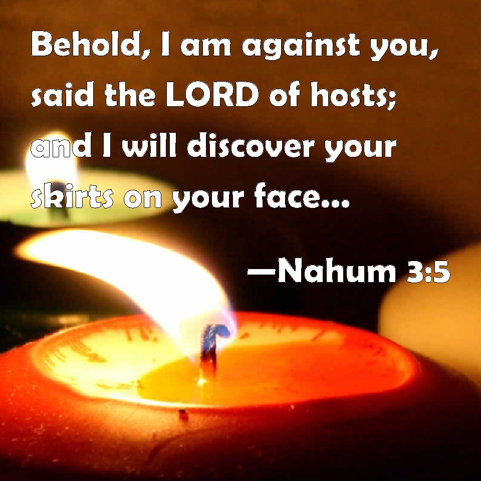 Choose a Background Nahum 3:5 Behold, I am against you, said the LORD of hosts; and I will discover your skirts on your face, and I will show the nations your nakedness, and the kingdoms your shame. KJV: Behold, I am against thee, saith the LORD of hosts; and I will discover thy skirts upon thy face, and I will shew the nations thy nakedness, and the kingdoms thy shame. DRB: Behold I come against thee, saith the Lord of hosts: and I will discover thy shame to thy face, and will shew thy nakedness to the nations, and thy shame to kingdoms. DBT: behold, I am against thee, saith Jehovah of hosts; and I will uncover thy skirts upon thy face, and I will shew the nations thy nakedness, and the kingdoms thy shame. ERV: Behold, I am against thee, saith the LORD of hosts, and I will discover thy skirts upon thy face; and I will shew the nations thy nakedness, and the kingdoms thy shame. WBT: Behold, I am against thee, saith the LORD of hosts; and I will remove thy skirts upon thy face, and I will show the nations thy nakedness, and the kingdoms thy shame. WEB: "Behold, I am against you," says Yahweh of Armies, "and I will lift your skirts over your face. I will show the nations your nakedness, and the kingdoms your shame. YLT: Lo, I am against thee, An affirmation of Jehovah of Hosts, And have removed thy skirts before thy face, And have shewed nations thy nakedness, And kingdoms thy shame,Links Nahum 3:5 NIV • Nahum 3:5 NLT • Nahum 3:5 ESV • Nahum 3:5 NASB • Nahum 3:5 KJV • Nahum 3:5 Interlinear • Nahum 3:5 Commentaries • Nahum 3:5 Parallel Texts • Nahum 3:5 Bible Apps • Nahum 3:5 Parallel • Bible Hub |