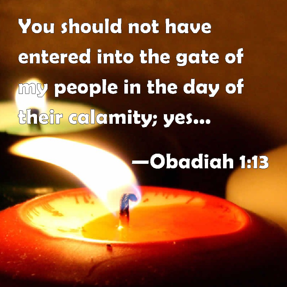 Choose a Background Obadiah 1:13 You should not have entered into the gate of my people in the day of their calamity; yes, you should not have looked on their affliction in the day of their calamity, nor have laid hands on their substance in the day of their calamity; KJV: Thou shouldest not have entered into the gate of my people in the day of their calamity; yea, thou shouldest not have looked on their affliction in the day of their calamity, nor have laid hands on their substance in the day of their calamity; DRB: Neither shalt thou enter into the gate of my people in the day of their ruin: neither shalt thou also look on in his evils in the day of his calamity: and thou shalt not be sent out against his army in the day of his desolation. DBT: Thou shouldest not have entered into the gate of my people in the day of their calamity, nor have looked, even thou, on their affliction in the day of their calamity, neither shouldest thou have laid hands on their substance in the day of their calamity; ERV: Enter not into the gate of my people in the day of their calamity; yea, look not thou on their affliction in the day of their calamity, neither lay ye hands on their substance in the day of their calamity. WBT: Thou shouldst not have entered into the gate of my people in the day of their calamity; yes, thou shouldst not have looked on their affliction in the day of their calamity, nor have laid hands on their substance in the day of their calamity; WEB: Don't enter into the gate of my people in the day of their calamity. Don't look down on their affliction in the day of their calamity, neither seize their wealth on the day of their calamity. YLT: Nor come into a gate of My people in a day of their calamity, Nor look, even thou, on its misfortune in a day of its calamity, Nor send forth against its force in a day of its calamity,Links Obadiah 1:13 NIV • Obadiah 1:13 NLT • Obadiah 1:13 ESV • Obadiah 1:13 NASB • Obadiah 1:13 KJV • Obadiah 1:13 Interlinear • Obadiah 1:13 Commentaries • Obadiah 1:13 Parallel Texts • Obadiah 1:13 Bible Apps • Obadiah 1:13 Parallel • Bible Hub |
