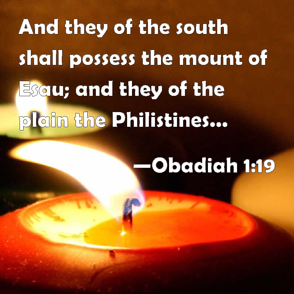 Choose a Background Obadiah 1:19 And they of the south shall possess the mount of Esau; and they of the plain the Philistines: and they shall possess the fields of Ephraim, and the fields of Samaria: and Benjamin shall possess Gilead. KJV: And they of the south shall possess the mount of Esau; and they of the plain the Philistines: and they shall possess the fields of Ephraim, and the fields of Samaria: and Benjamin shall possess Gilead. DRB: And they that are toward the south, shall inherit the mount of Esau, and they that are in the plains, the Philistines: and they shall possess the country of Ephraim, and the country of Samaria: and Benjamin shall possess Galaad. DBT: And they of the south shall possess the mount of Esau; and they of the lowland the Philistines; yea, they shall possess the field of Ephraim and the field of Samaria; and Benjamin shall possess Gilead; ERV: And they of the South shall possess the mount of Esau; and they of the lowland the Philistines and they shall possess the field of Ephraim, and the field of Samaria: and Benjamin shall possess Gilead. WBT: And they of the south shall possess the mount of Esau; and they of the plain the Philistines: and they shall possess the fields of Ephraim, and the fields of Samaria: and Benjamin shall possess Gilead. WEB: Those of the South will possess the mountain of Esau, and those of the lowland, the Philistines. They will possess the field of Ephraim, and the field of Samaria. Benjamin will possess Gilead. YLT: And they have possessed the south with the mount of Esau, And the low country with the Philistines, And they have possessed the field of Ephraim, And the field of Samaria, And Benjamin with Gilead.Links Obadiah 1:19 NIV • Obadiah 1:19 NLT • Obadiah 1:19 ESV • Obadiah 1:19 NASB • Obadiah 1:19 KJV • Obadiah 1:19 Interlinear • Obadiah 1:19 Commentaries • Obadiah 1:19 Parallel Texts • Obadiah 1:19 Bible Apps • Obadiah 1:19 Parallel • Bible Hub |