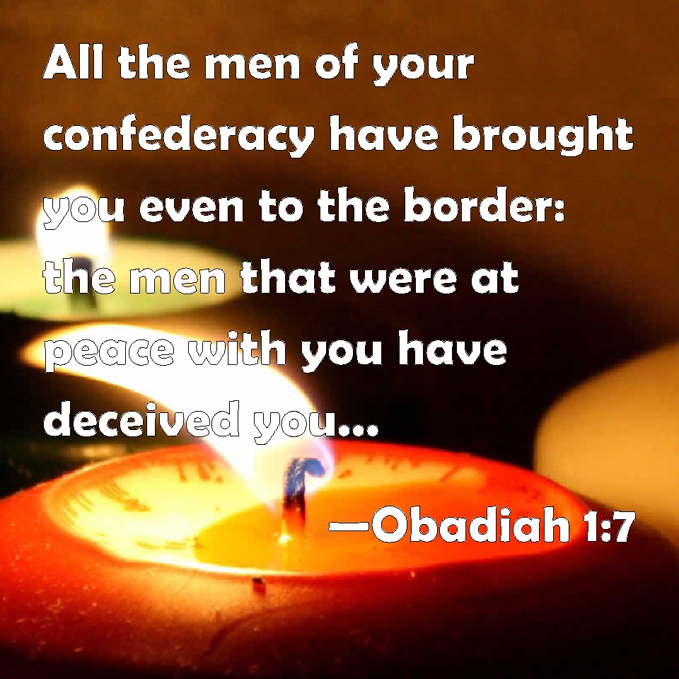 Choose a Background Obadiah 1:7 All the men of your confederacy have brought you even to the border: the men that were at peace with you have deceived you, and prevailed against you; that they eat your bread have laid a wound under you: there is none understanding in him. KJV: All the men of thy confederacy have brought thee even to the border: the men that were at peace with thee have deceived thee, and prevailed against thee; they that eat thy bread have laid a wound under thee: there is none understanding in him. DRB: They have sent thee out even to the border: all the men of thy confederacy have deceived thee: the men of thy peace have prevailed against thee: they that eat with thee shall lay snares under thee: there is no wisdom in him. DBT: All the men of thy confederacy have pushed thee to the border; the men that were at peace with thee have deceived thee, they have prevailed against thee; they that eat thy bread have laid a snare under thee. There is no understanding in him. ERV: All the men of thy confederacy have brought thee on thy way, even to the border: the men that were at peace with thee have deceived thee, and prevailed against thee; they that eat thy bread lay a snare under thee: there is none understanding in him. WBT: All the men of thy confederacy have brought thee even to the border: the men that were at peace with thee have deceived thee, and prevailed against thee; they that eat thy bread have laid a wound under thee: there is no understanding in him. WEB: All the men of your alliance have brought you on your way, even to the border. The men who were at peace with you have deceived you, and prevailed against you. Friends who eat your bread lay a snare under you. There is no understanding in him." YLT: Unto the border sent thee have all thine allies, Forgotten thee, prevailed over thee, have thy friends, Thy bread they make a snare under thee, There is no understanding in him!Links Obadiah 1:7 NIV • Obadiah 1:7 NLT • Obadiah 1:7 ESV • Obadiah 1:7 NASB • Obadiah 1:7 KJV • Obadiah 1:7 Interlinear • Obadiah 1:7 Commentaries • Obadiah 1:7 Parallel Texts • Obadiah 1:7 Bible Apps • Obadiah 1:7 Parallel • Bible Hub |