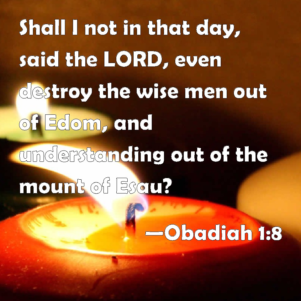 Choose a Background Obadiah 1:8 Shall I not in that day, said the LORD, even destroy the wise men out of Edom, and understanding out of the mount of Esau? KJV: Shall I not in that day, saith the LORD, even destroy the wise men out of Edom, and understanding out of the mount of Esau? DRB: Shall not I in that day, saith the Lord, destroy the wise out of Edom, and understanding out of the mount of Esau ? DBT: Shall I not in that day, saith Jehovah, destroy the wise men out of Edom, and understanding out of the mount of Esau? ERV: Shall I not in that day, saith the LORD, destroy the wise men out of Edom, and understanding out of the mount of Esau? WBT: Shall I not in that day, saith the LORD, even destroy the wise men out of Edom, and understanding out of the mount of Esau? WEB: "Won't I in that day," says Yahweh, "destroy the wise men out of Edom, and understanding out of the mountain of Esau? YLT: Is it not in that day — an affirmation of Jehovah, That I have destroyed the wise out of Edom, And understanding out of the mount of Esau?Links Obadiah 1:8 NIV • Obadiah 1:8 NLT • Obadiah 1:8 ESV • Obadiah 1:8 NASB • Obadiah 1:8 KJV • Obadiah 1:8 Interlinear • Obadiah 1:8 Commentaries • Obadiah 1:8 Parallel Texts • Obadiah 1:8 Bible Apps • Obadiah 1:8 Parallel • Bible Hub |